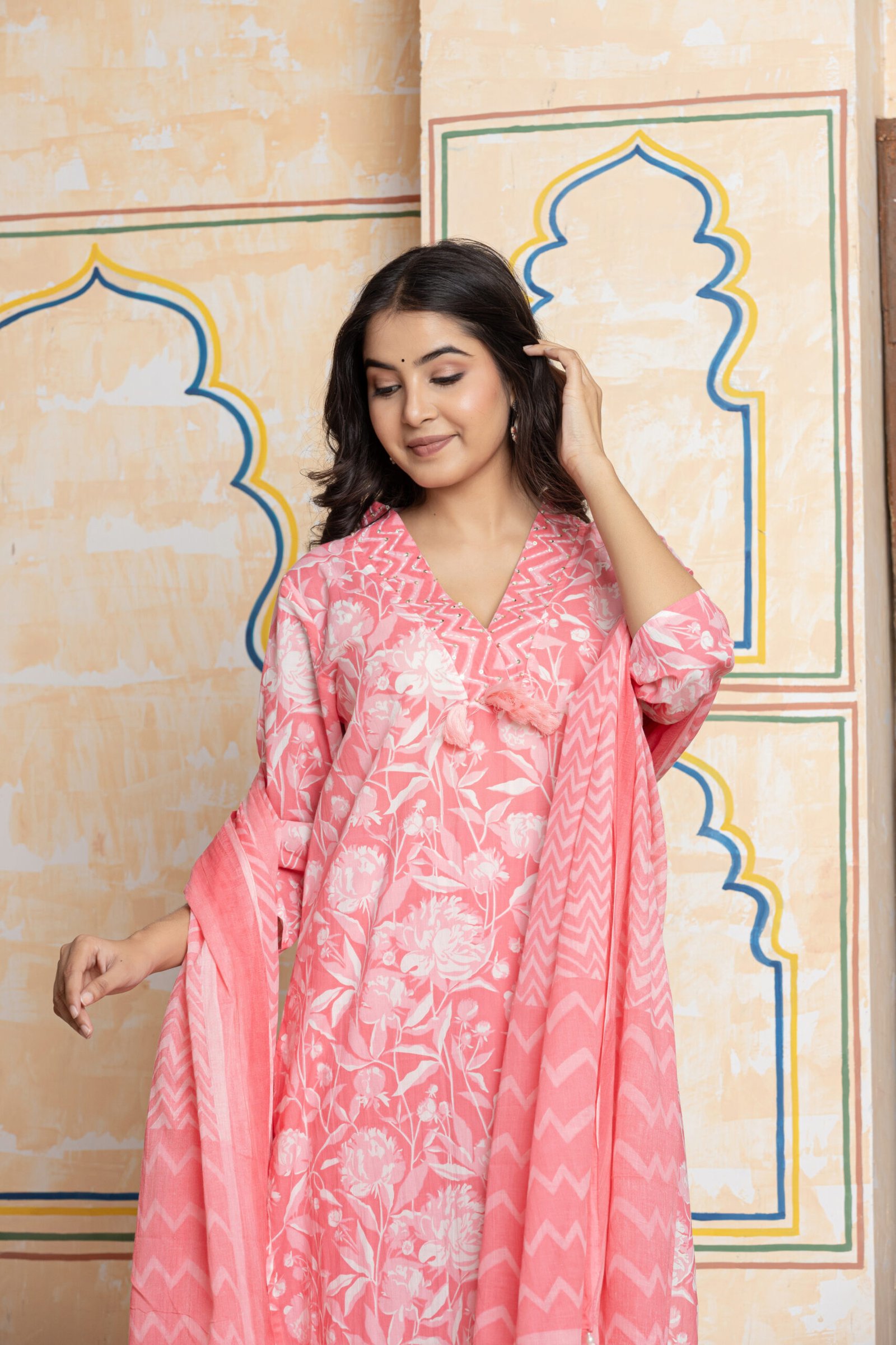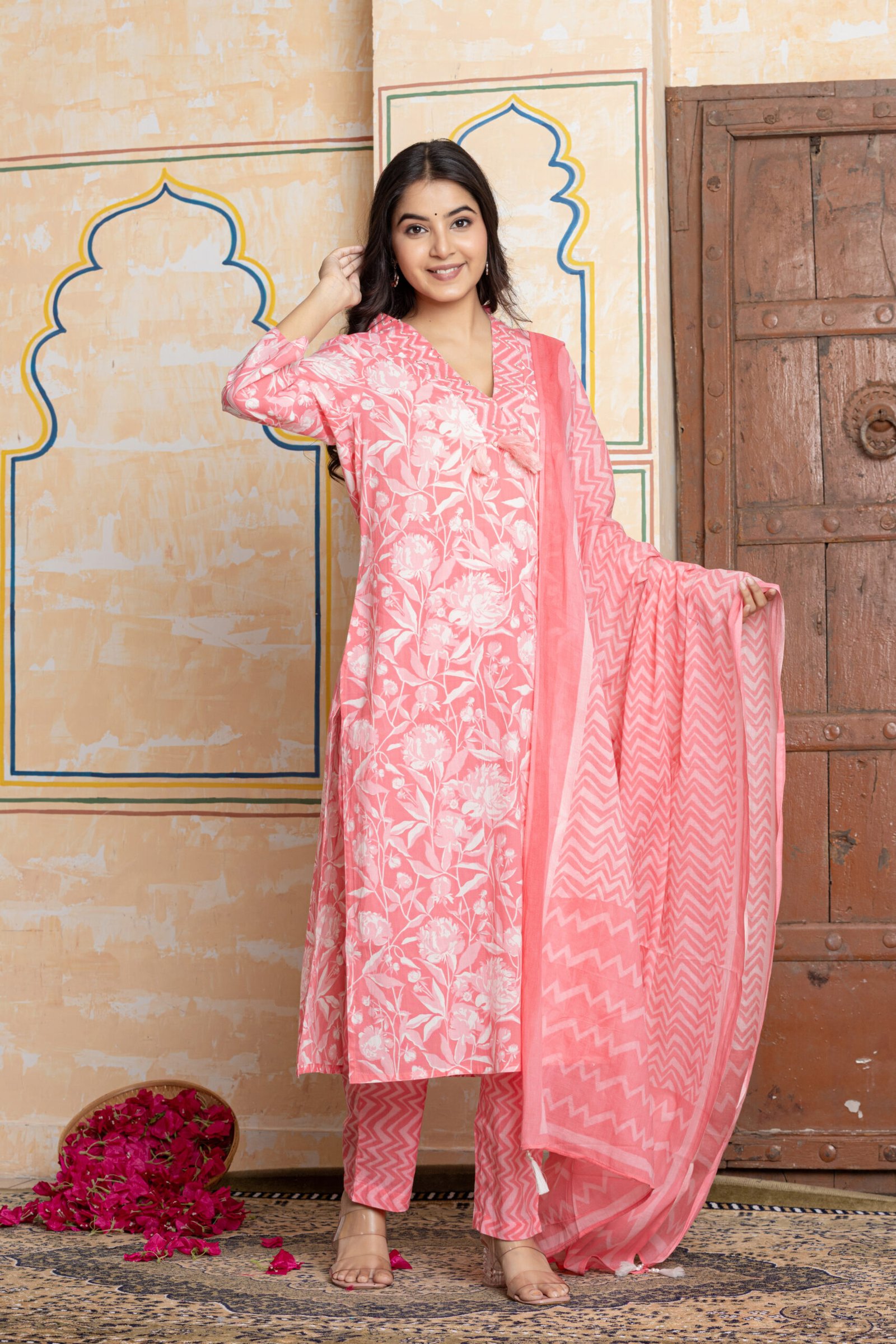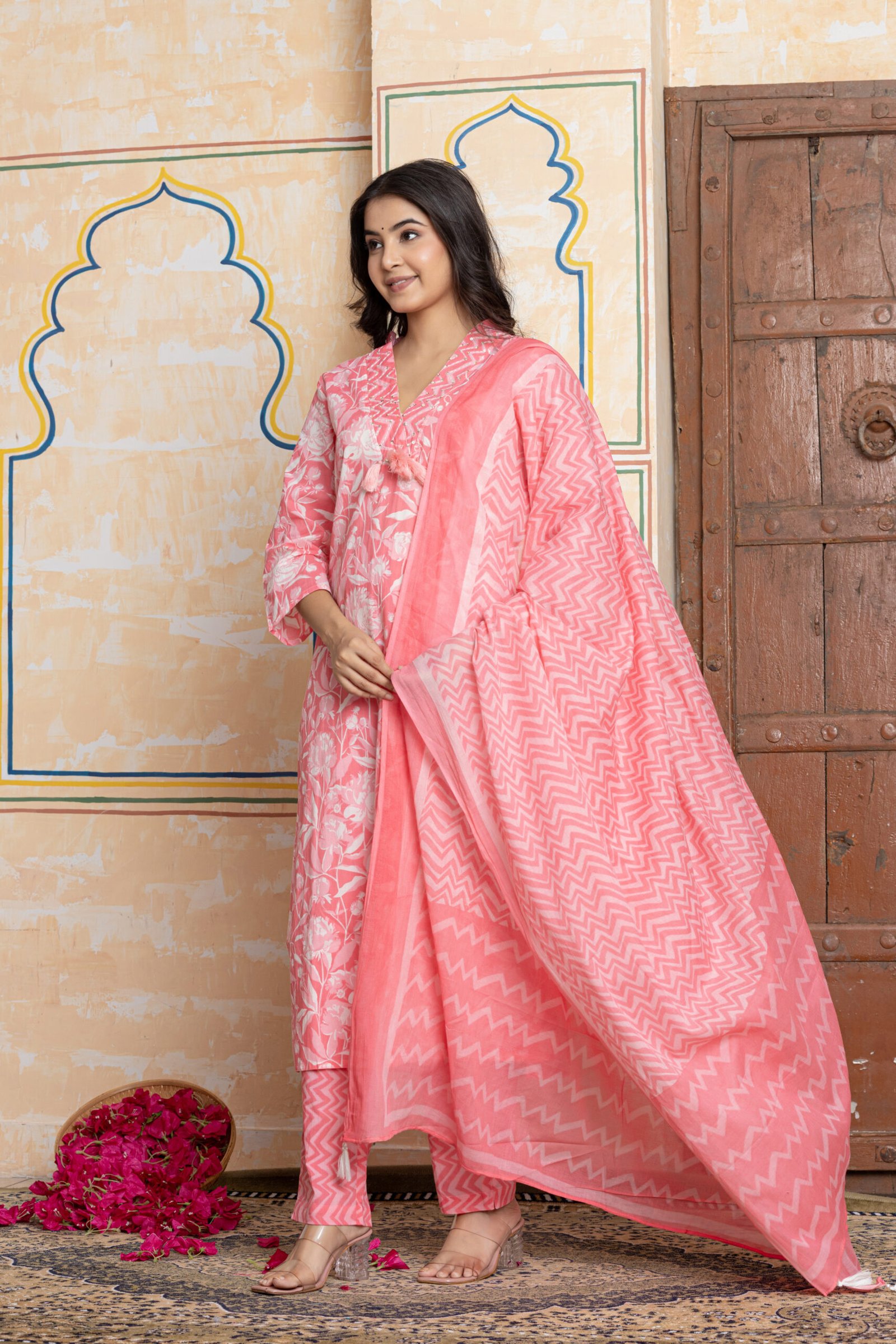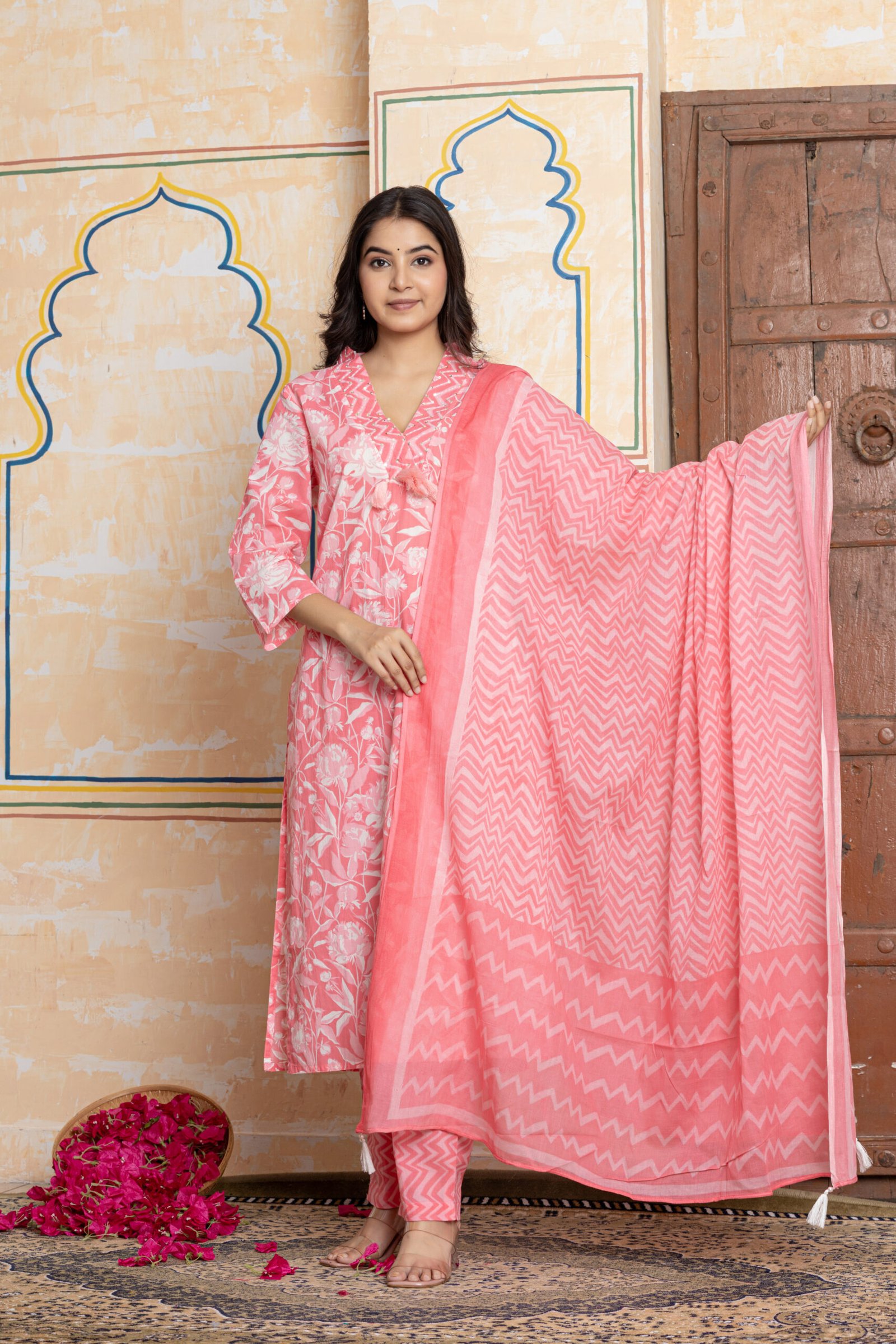 Add a fresh and feminine touch to your ethnic collection with this beautiful pink suit set, crafted from pure cotton for day-long comfort. The set features a floral printed kurta, striped pants, and a coordinated dupatta—ideal for festive occasions, casual outings, or summer events.