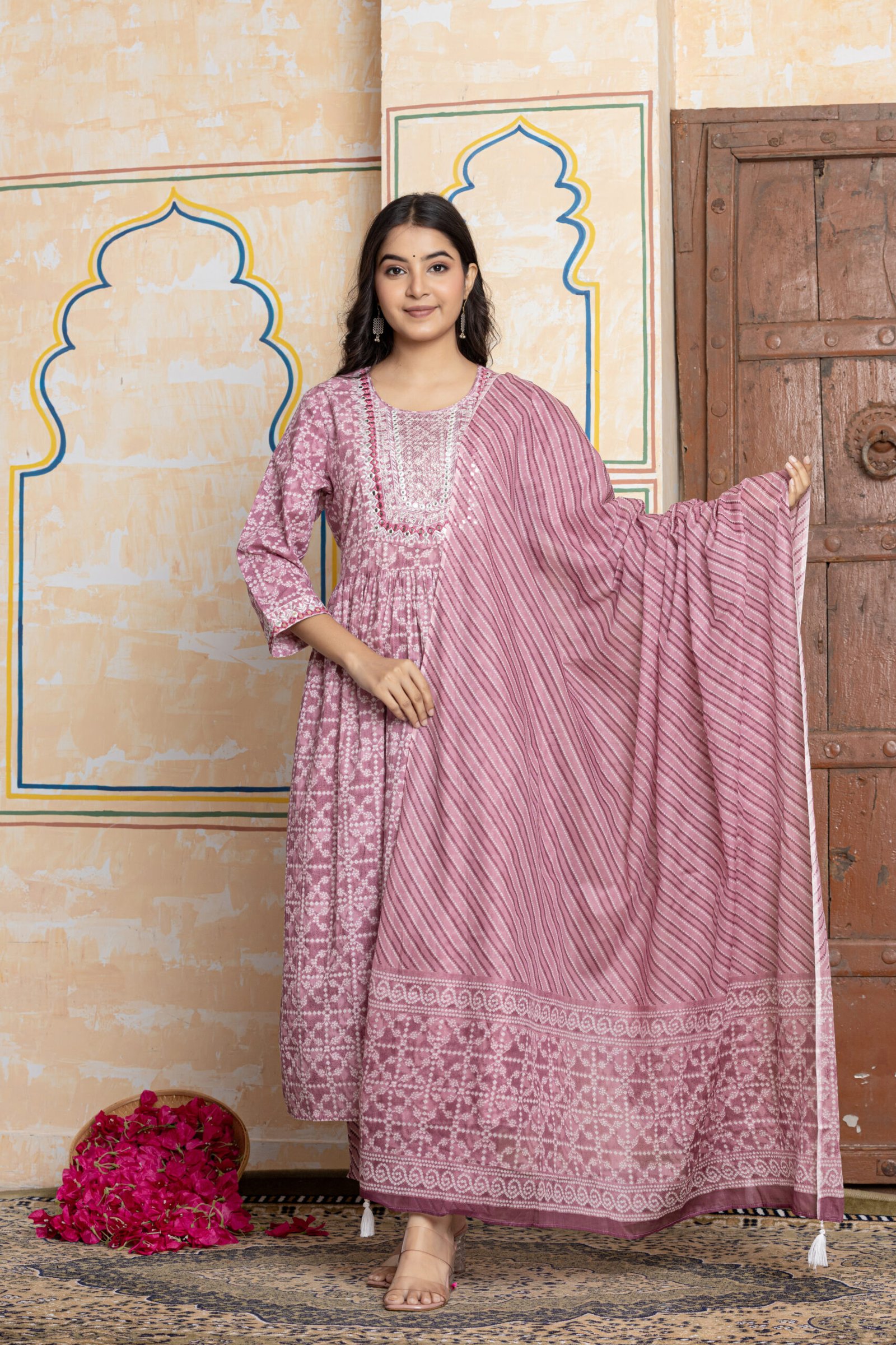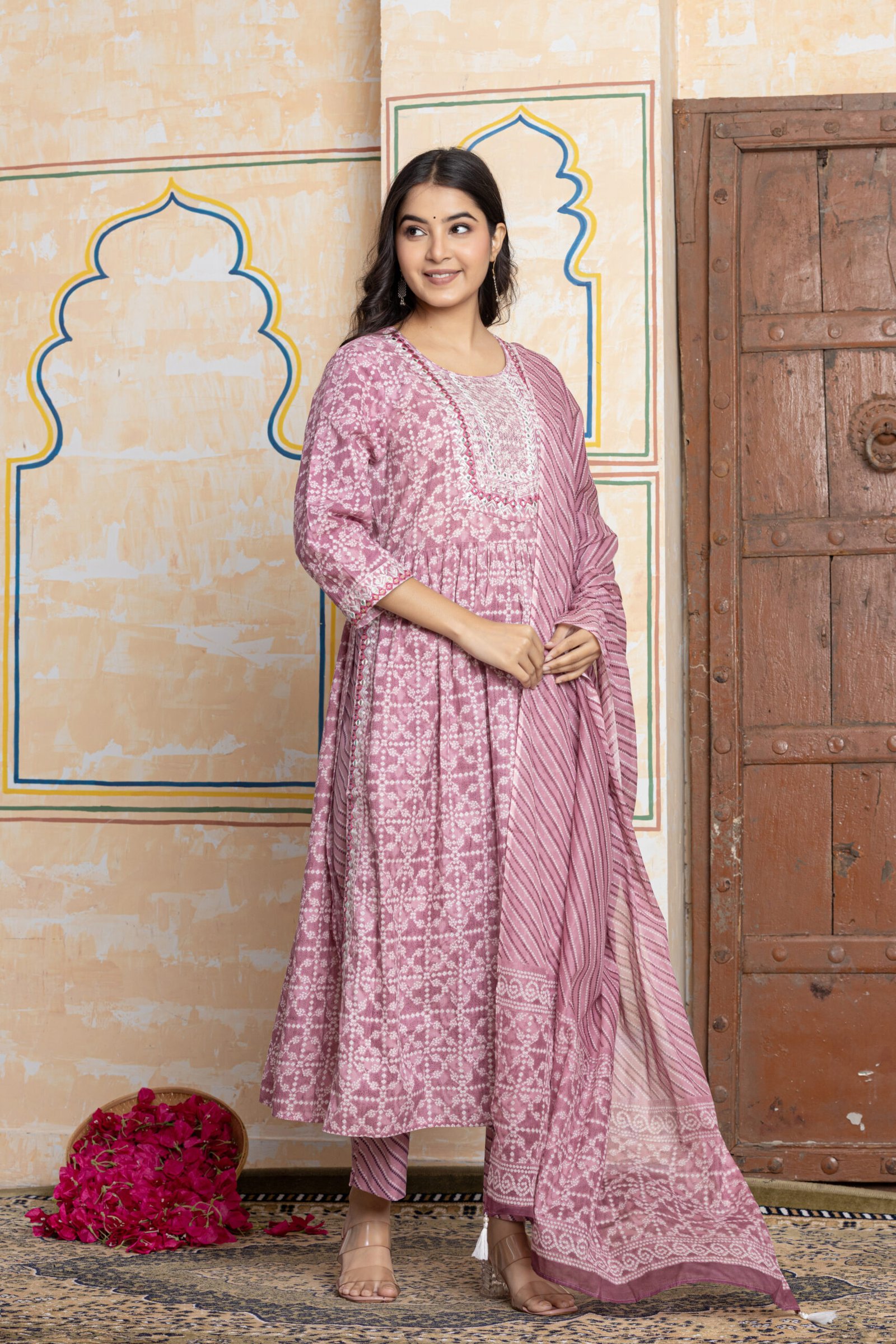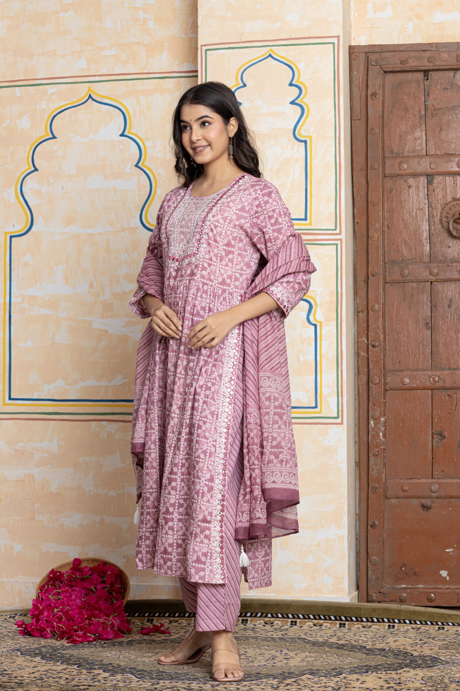 Bring a traditional royal charm to your ethnic wardrobe with this stunning pink Anarkali kurta pant dupatta set. Adorned with intricate Bandhani-inspired prints and embroidery, this elegant three-piece ensemble is crafted from soft pure cotton, making it ideal for festive occasions, family functions, or special gatherings.