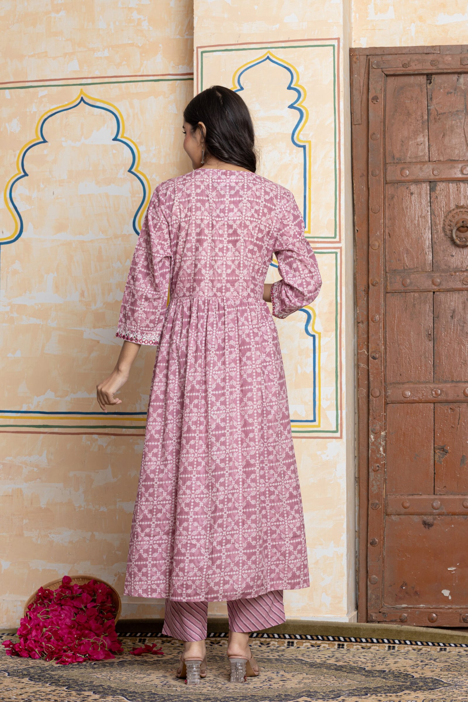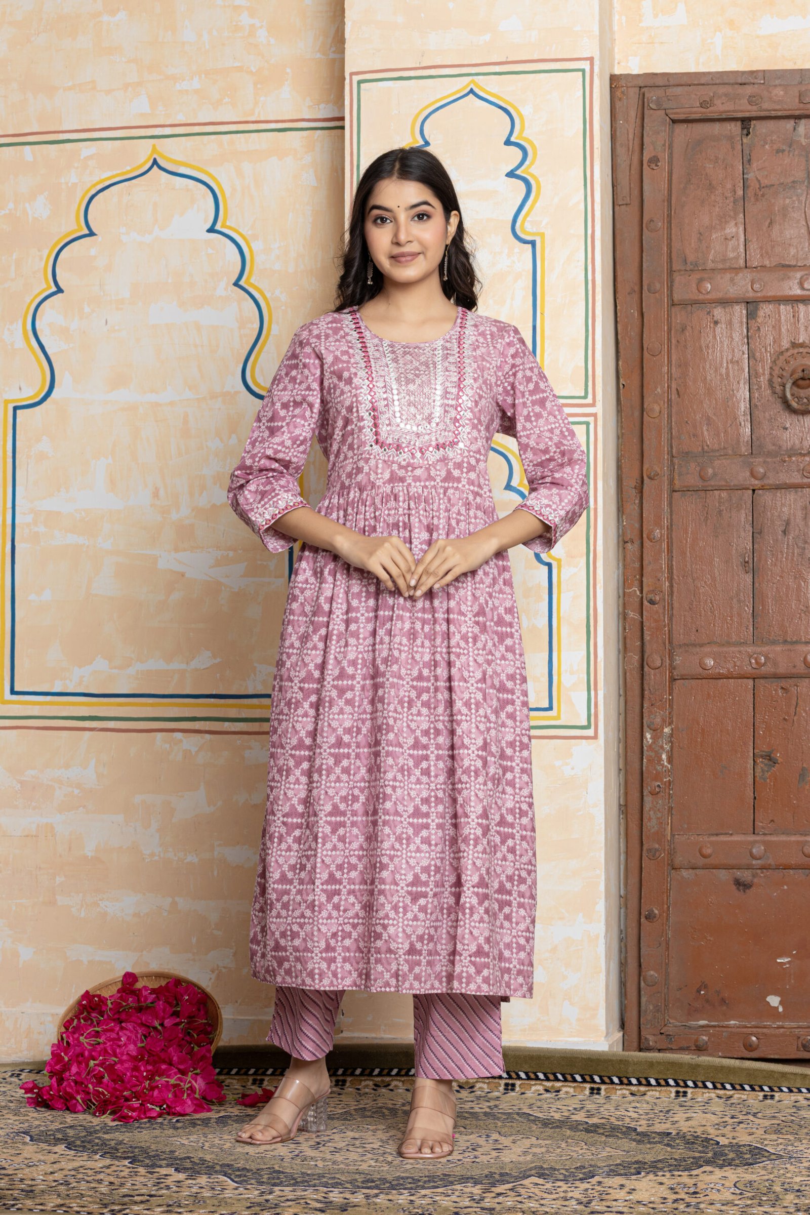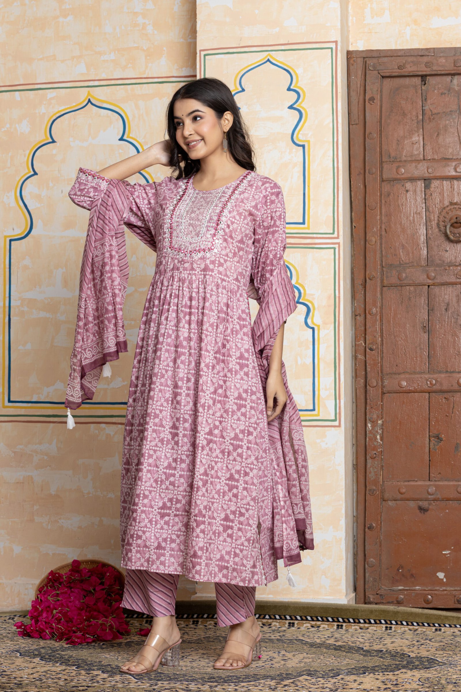 Bring a traditional royal charm to your ethnic wardrobe with this stunning pink Anarkali kurta pant dupatta set. Adorned with intricate Bandhani-inspired prints and embroidery, this elegant three-piece ensemble is crafted from soft pure cotton, making it ideal for festive occasions, family functions, or special gatherings.