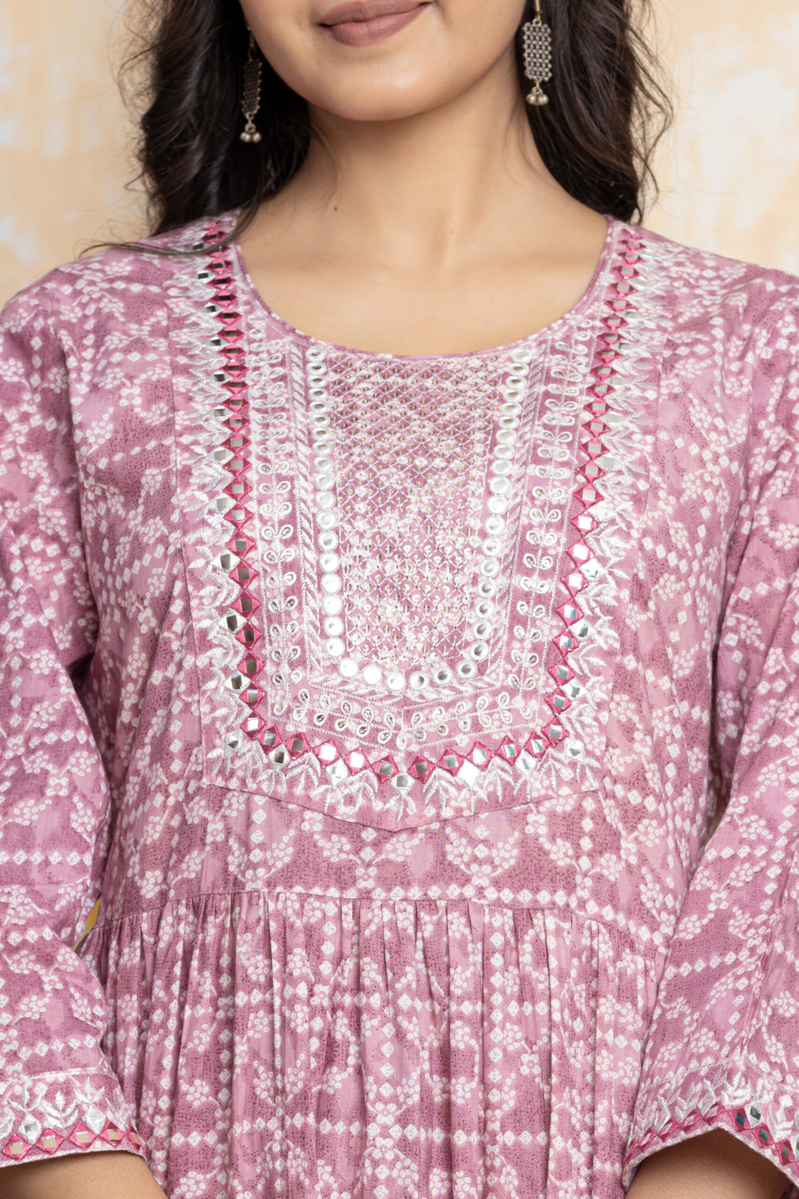 Pink Bandhani Print Anarkali Kurta Pant Dupatta Set