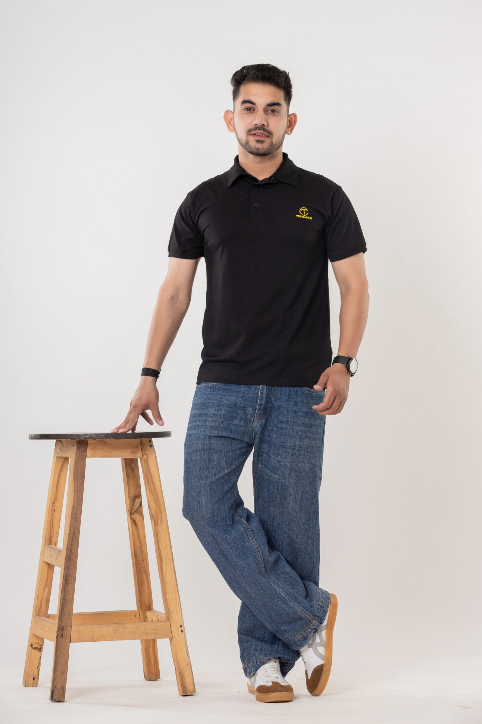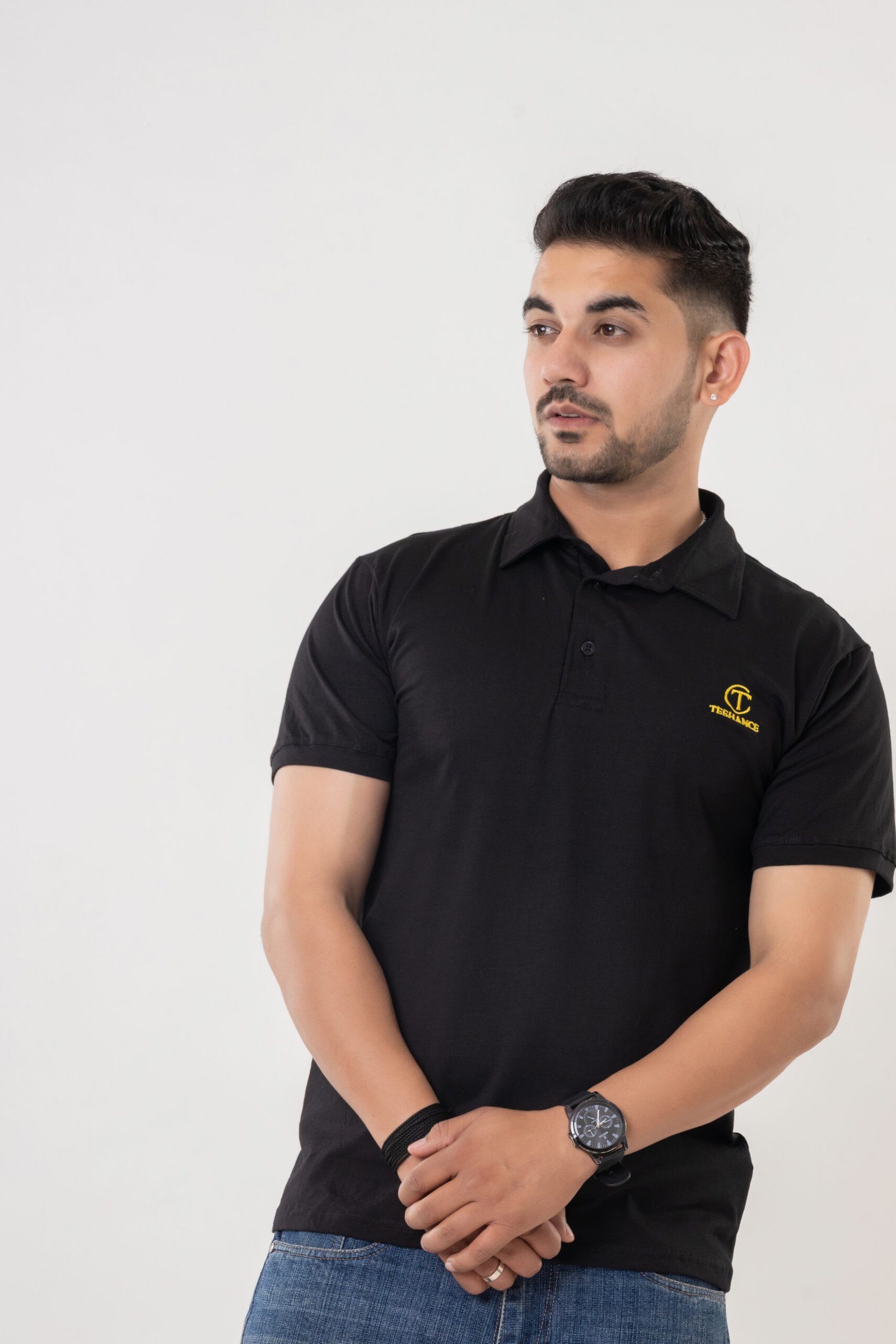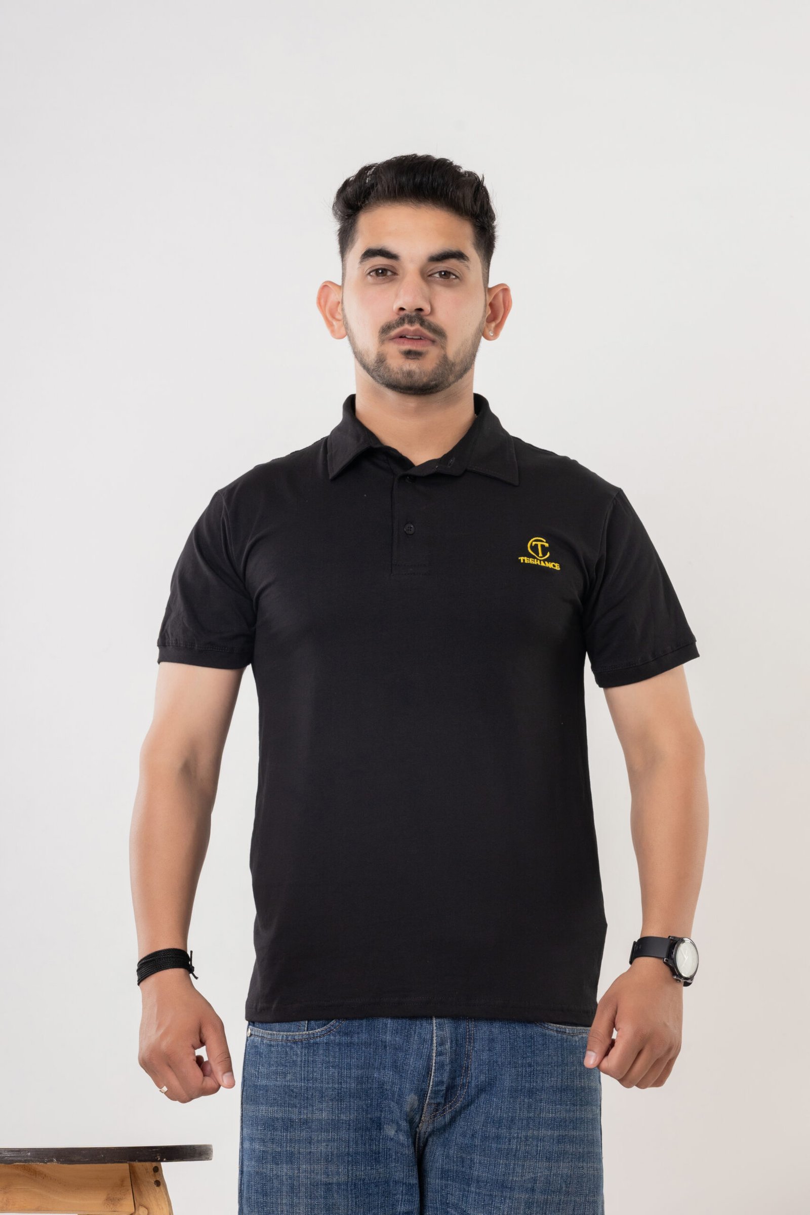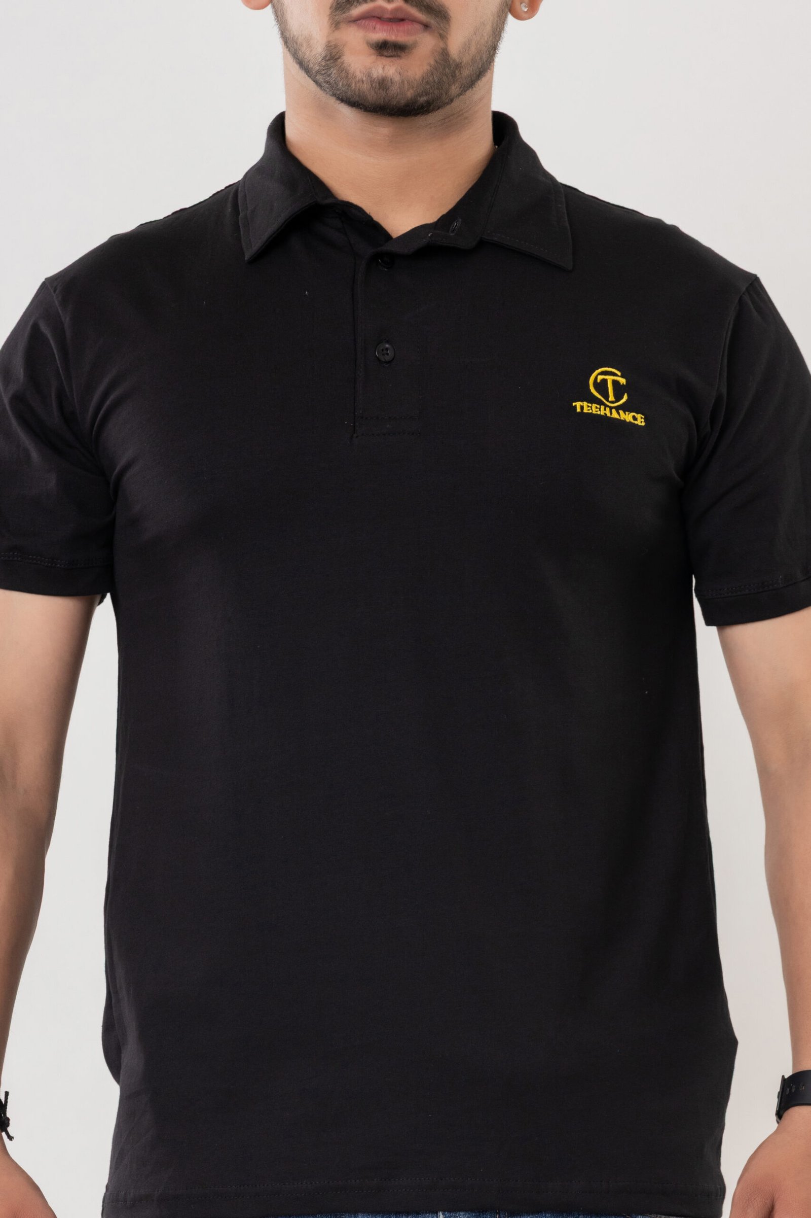 Elevate your everyday wardrobe with this Teehance men’s black polo t-shirt, designed for smart comfort and versatility. Made from premium quality pure cotton, this t-shirt offers a soft, breathable texture for all-day ease. The classic polo collar and buttoned placket deliver a timeless look, while the short sleeves with ribbed cuffs ensure a neat fit. The minimalistic yellow Teehance logo embroidered on the chest adds a subtle brand touch, making it suitable for work, outings, or daily wear. The solid black color pairs effortlessly with jeans, trousers, or shorts for a sharp appearance.