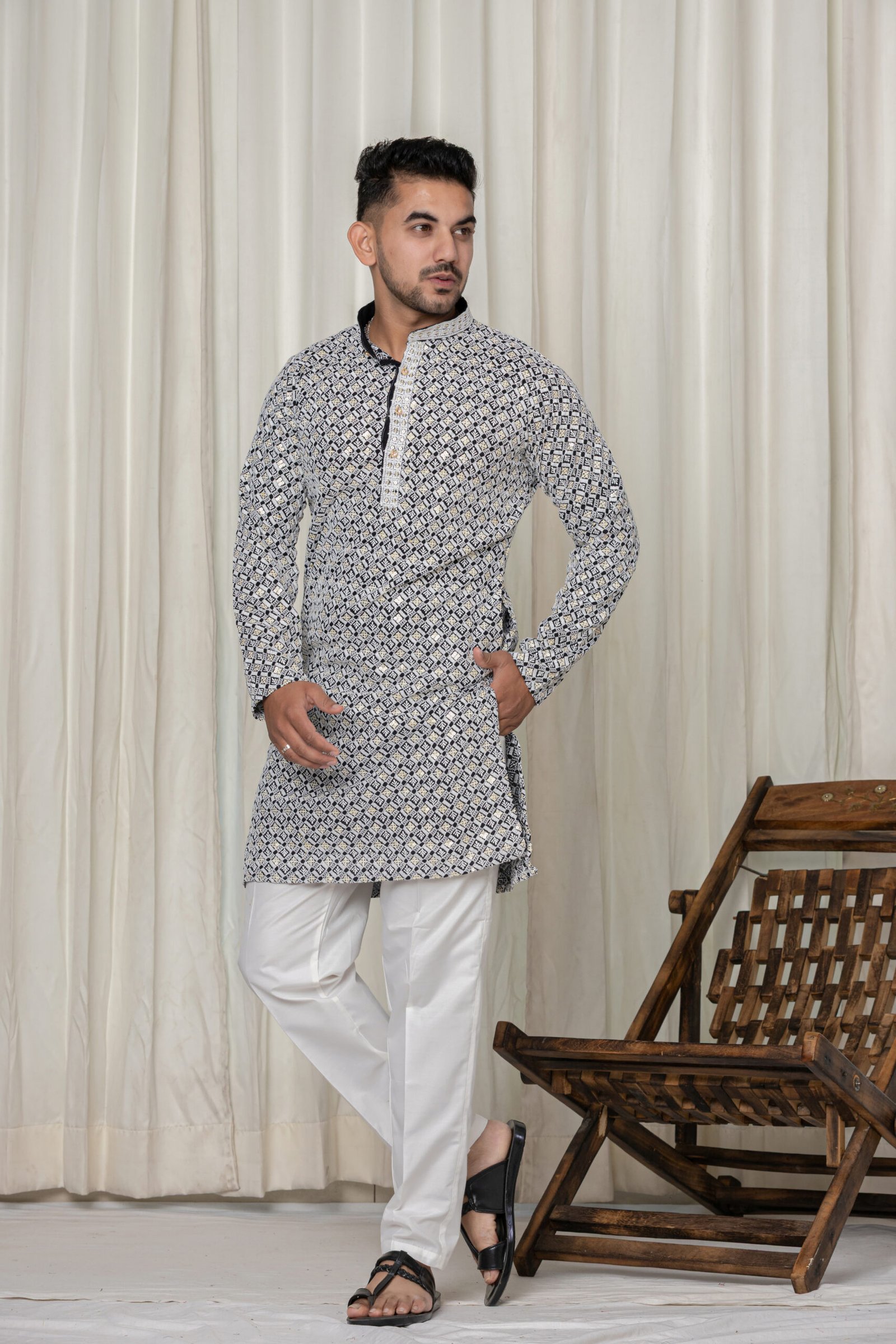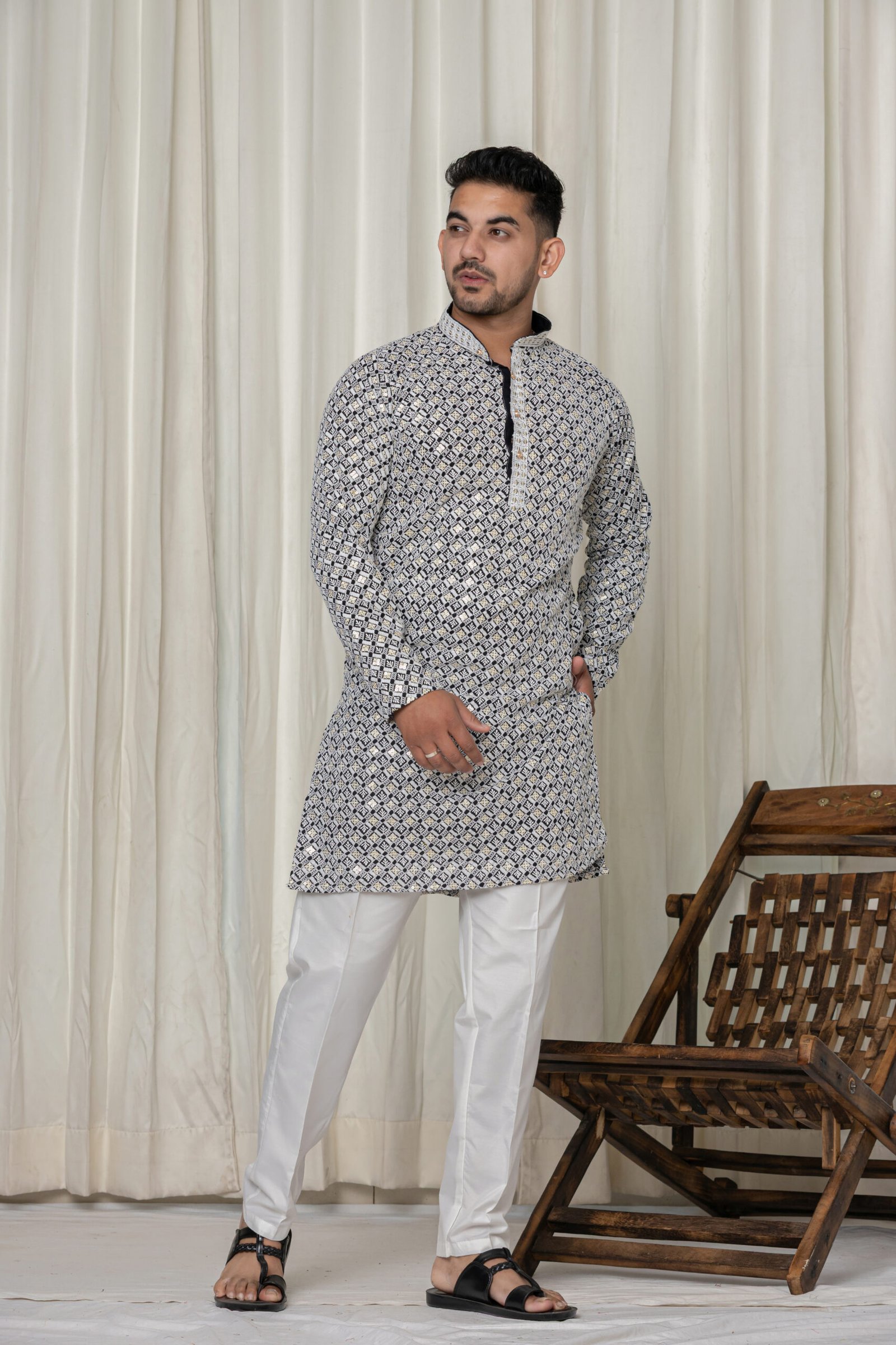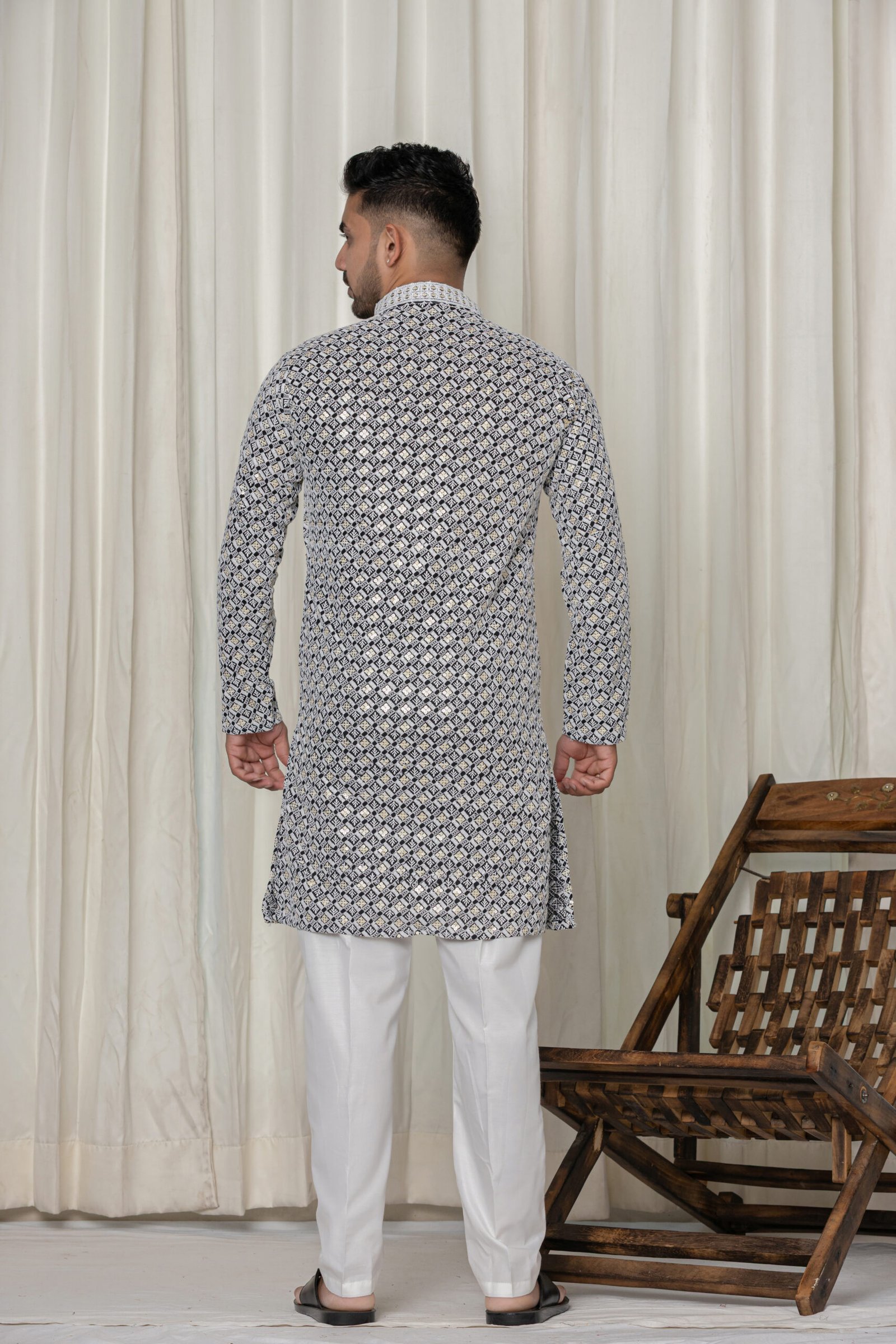 Upgrade your ethnic collection with this sophisticated men’s black and white jacquard kurta paired with a classic white pajama. Designed for modern festive style, this kurta features an intricate all-over geometric pattern in white and gold on a rich black base, crafted with premium jacquard fabric for a textured shine and luxurious feel. The detailed mandarin collar and designer placket with gold buttons add a regal touch, making it perfect for weddings, celebrations, pooja, or family functions.