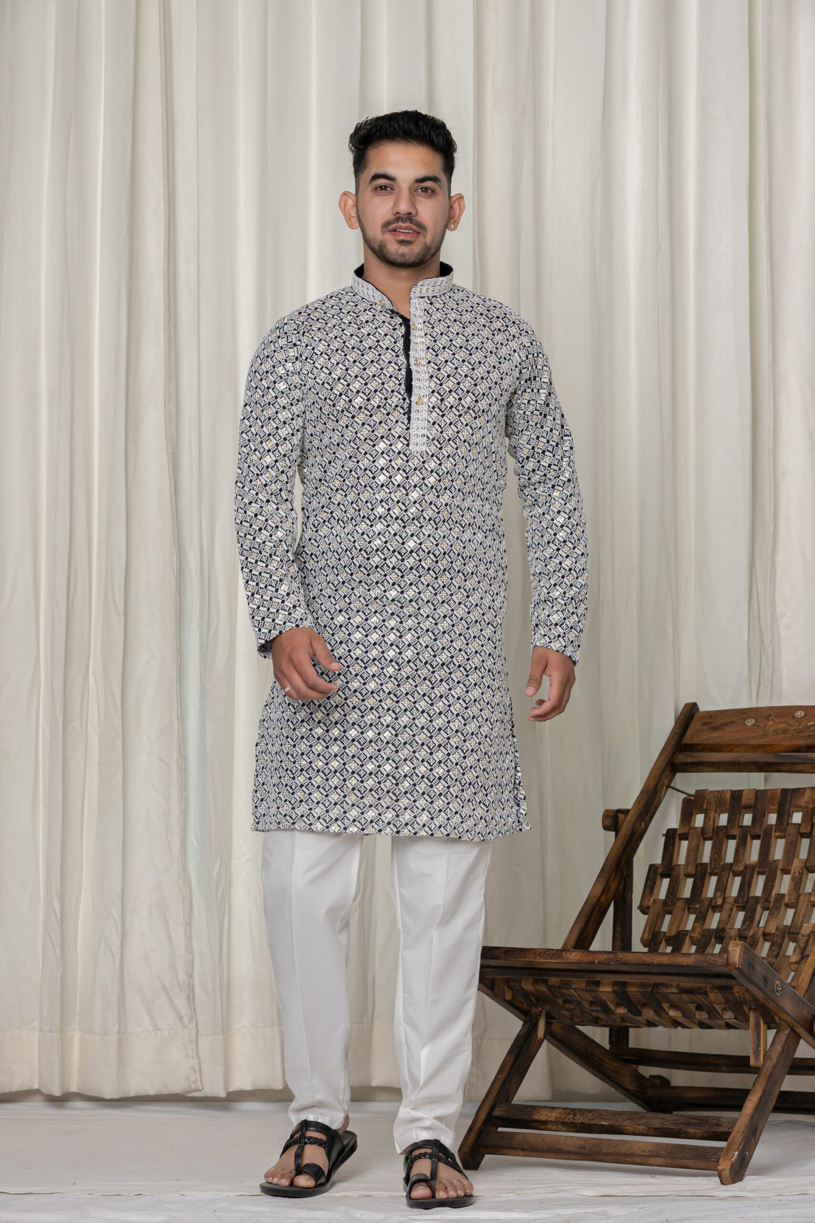 Men's Black & White Jacquard Designer Kurta with White Pajama
