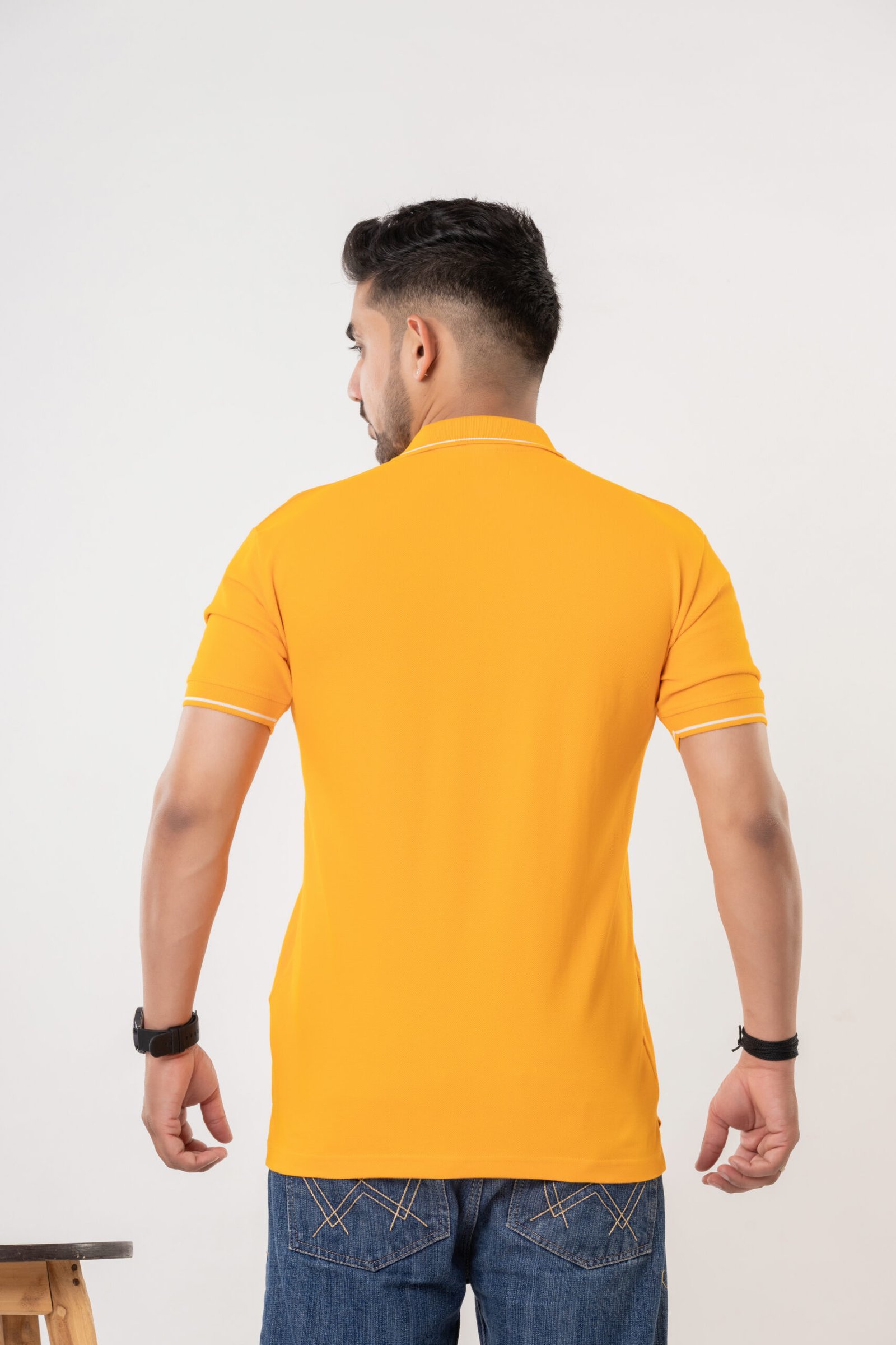 Colour: Mustard yellow with white collar and sleeve tipping, black embroidered logo