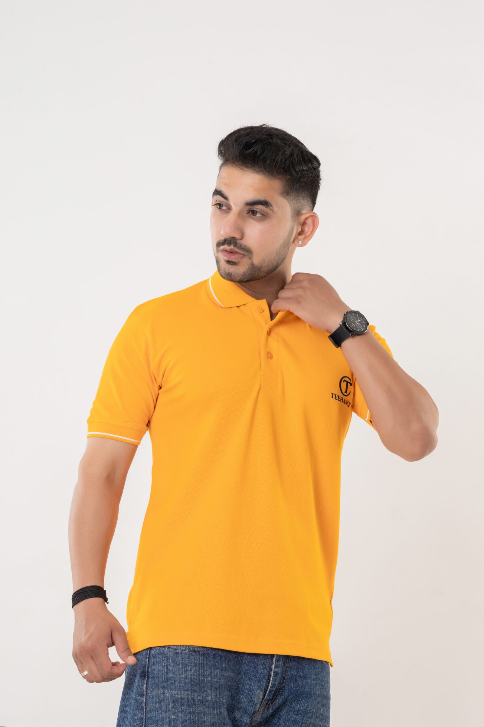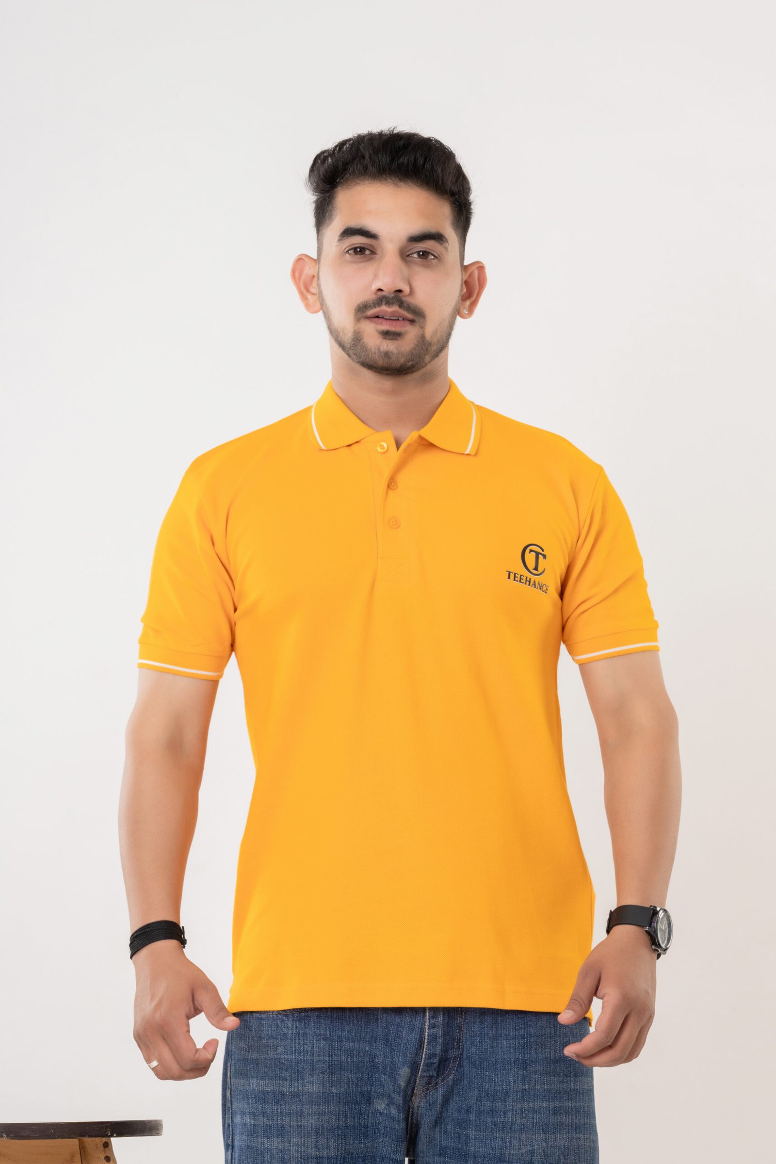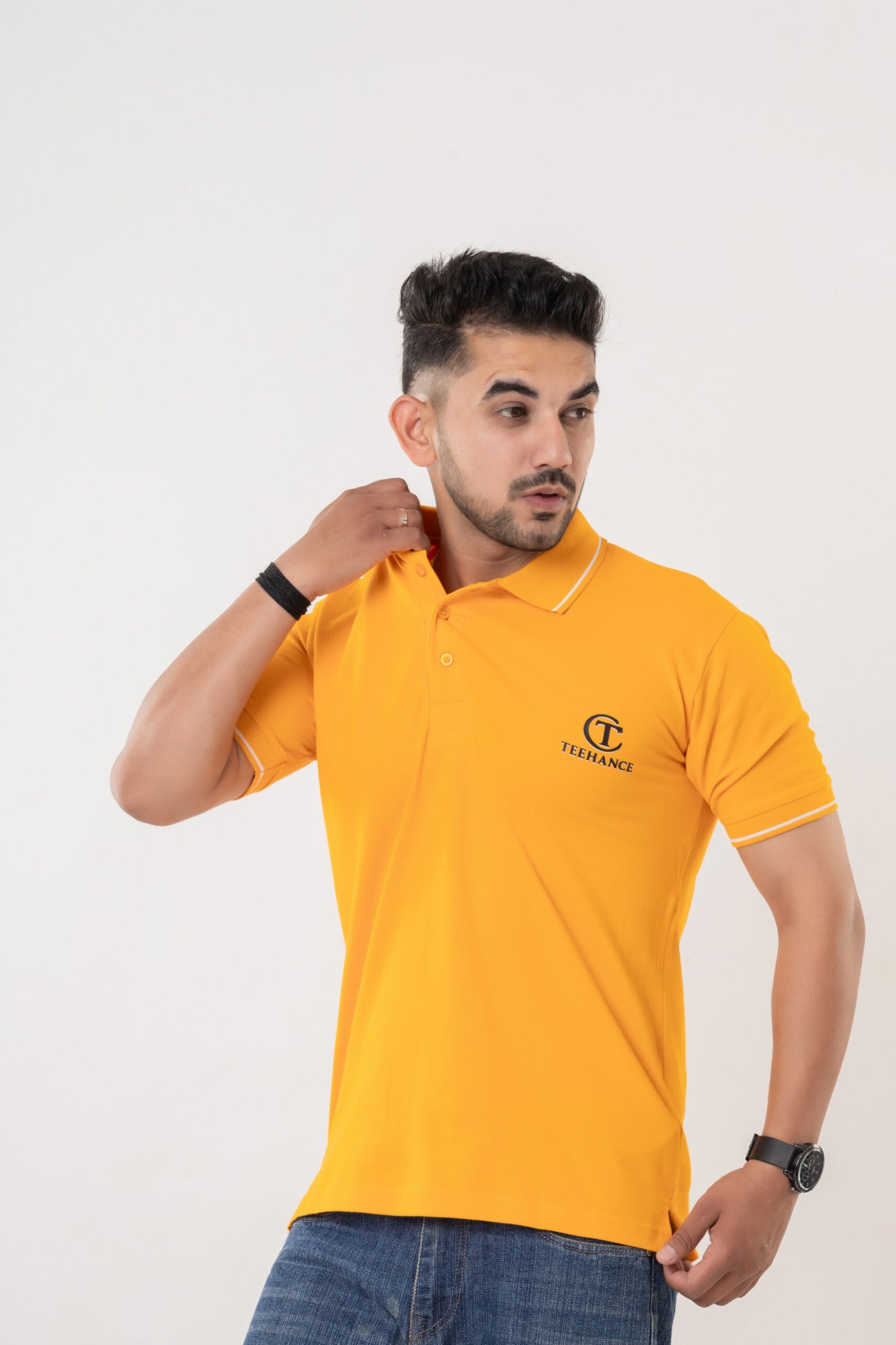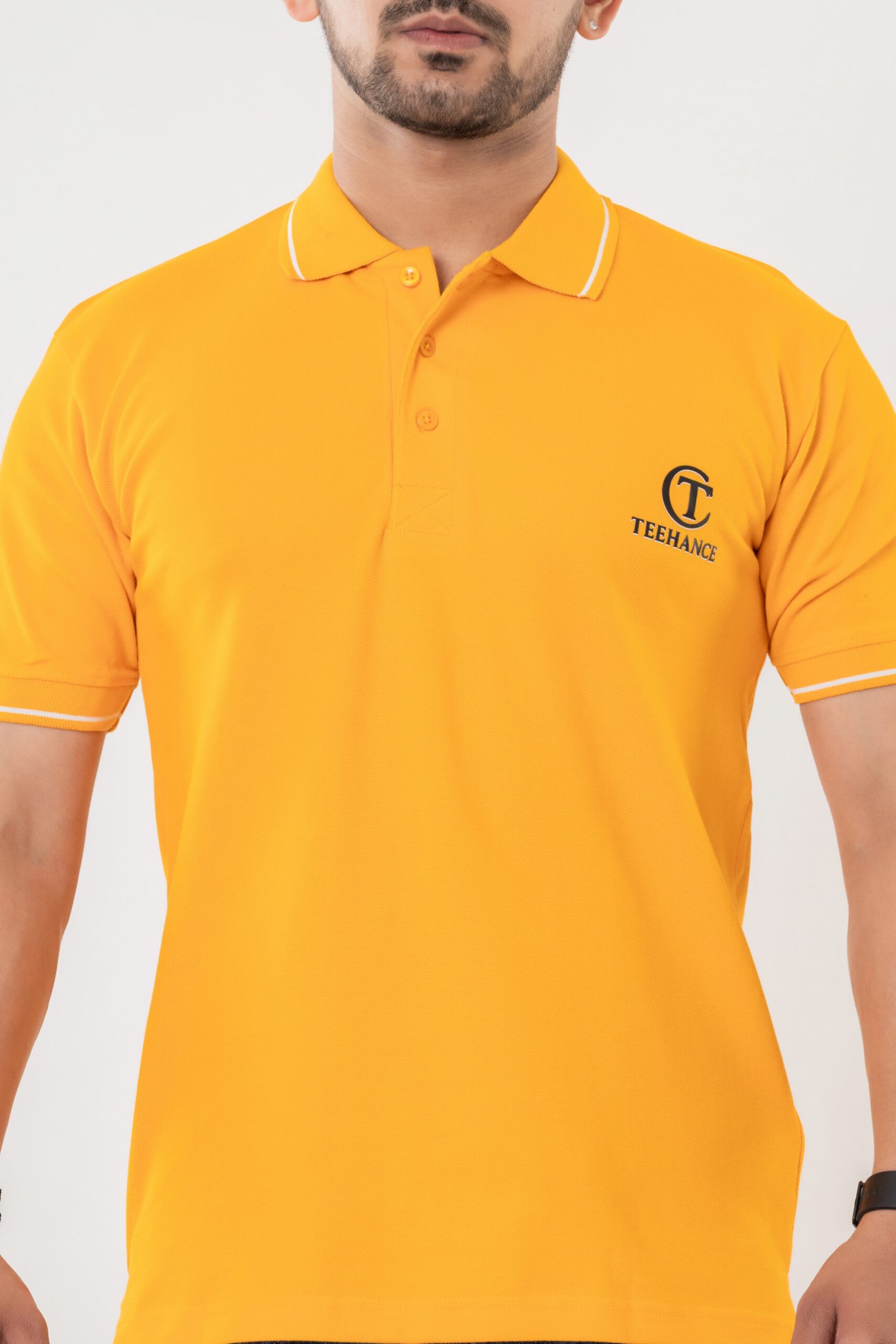 Add vibrant style to your wardrobe with this Teehance men’s mustard yellow polo t-shirt, designed for smart comfort and a polished look. Made from premium quality cotton, this polo features a classic ribbed collar and cuffs highlighted with white tipping for extra detail. The chest is finished with a sharp black Teehance logo embroidery, adding a touch of subtle branding. Its regular fit, breathable fabric, and two-button placket make it perfect for office, outings, or everyday wear. Pair effortlessly with jeans or chinos for a confident, modern appearance.