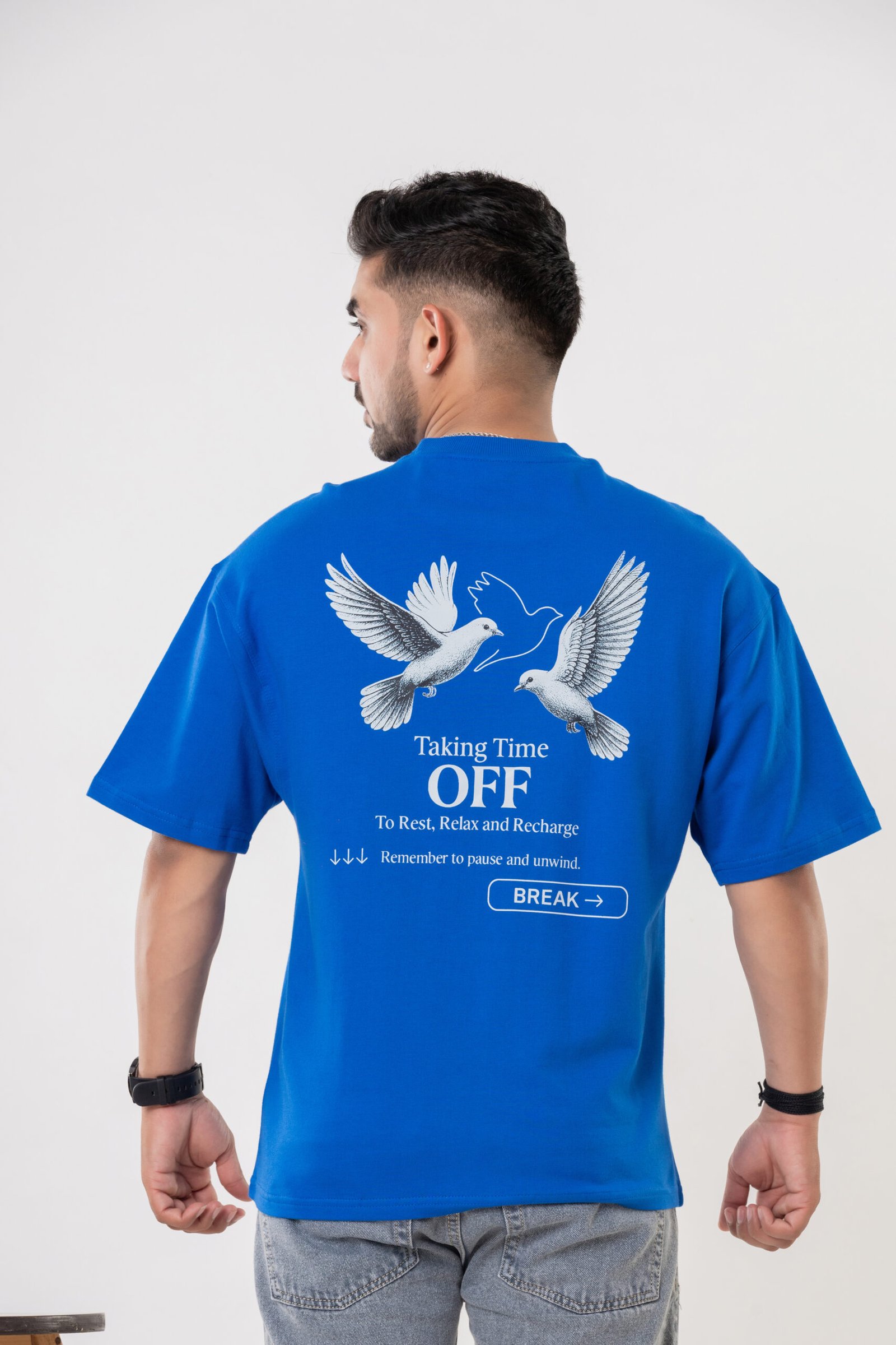 Add vibrance to your casual wardrobe with this Teehance men’s royal blue oversized t-shirt, designed for unmatched comfort and modern street style. Crafted from soft, breathable pure cotton, this t-shirt offers a relaxed oversized fit with drop shoulders. The front features the Teehance yellow logo and the tagline “STYLE THAT SPEAKS,” embroidered for a premium look. The back stands out with an artistic double dove graphic and motivational typography: “Taking Time OFF – To Rest, Relax and Recharge. Remember to pause and unwind. BREAK.” This combination makes it a perfect everyday statement piece.