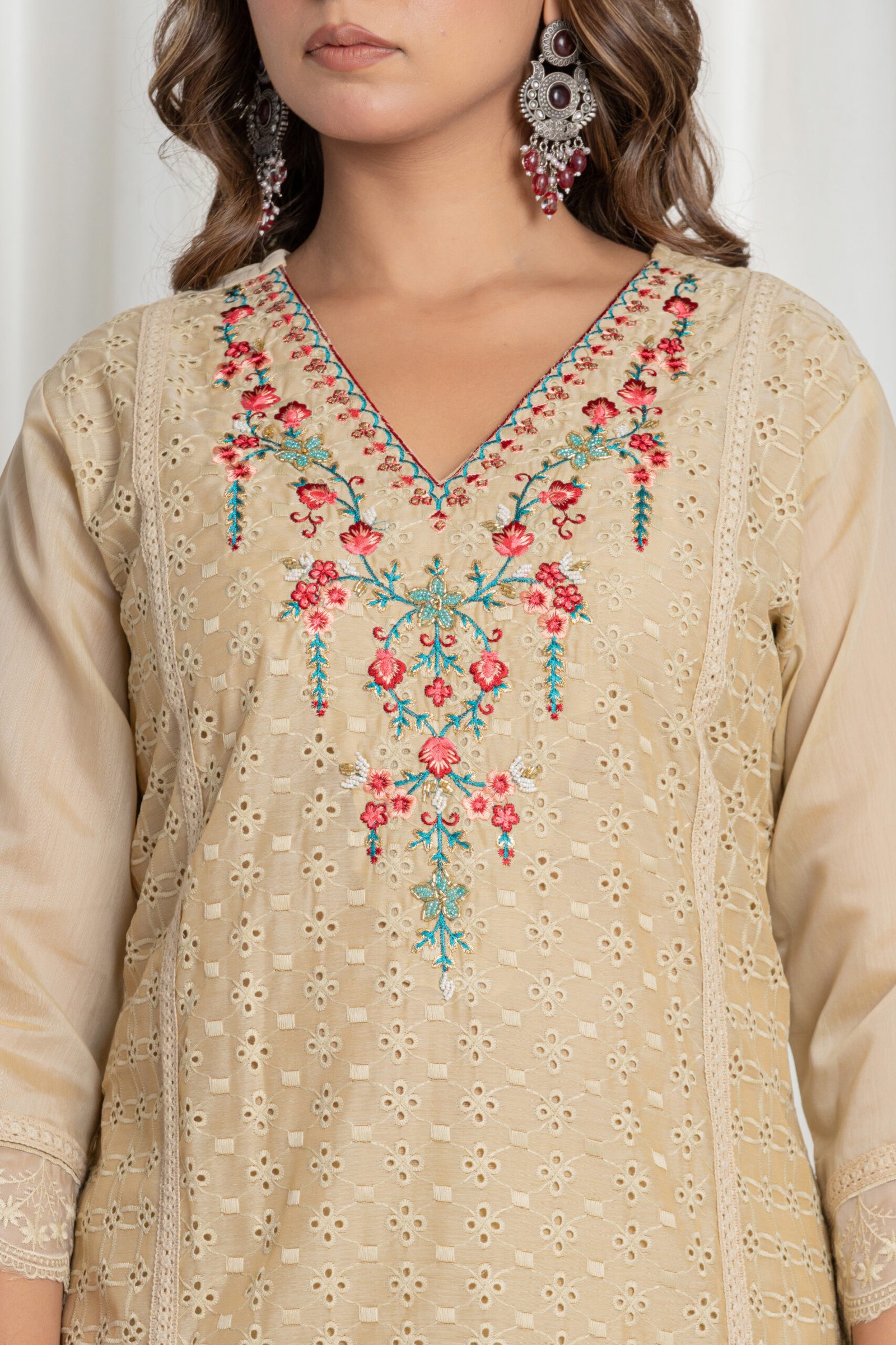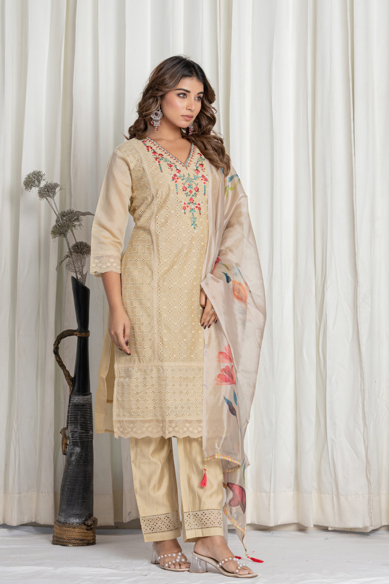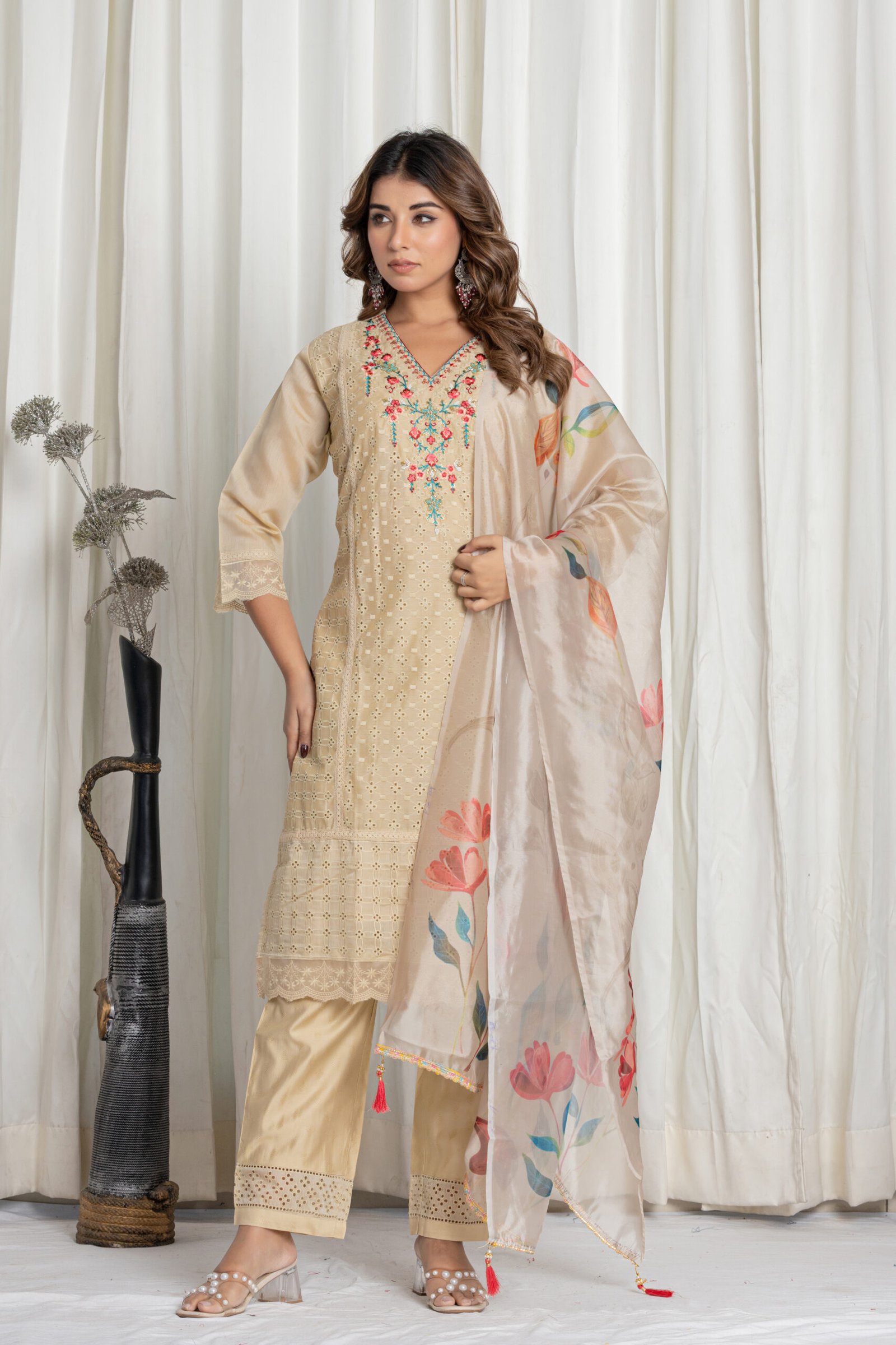 Women’s Beige Chikankari Embroidered Cotton Suit Set with Organza Floral Dupatta