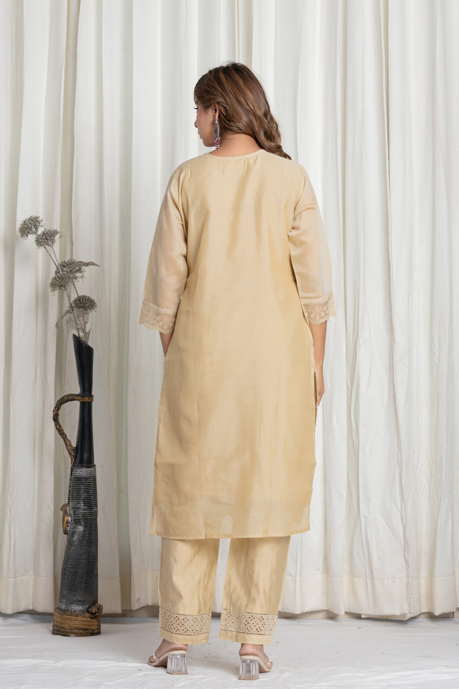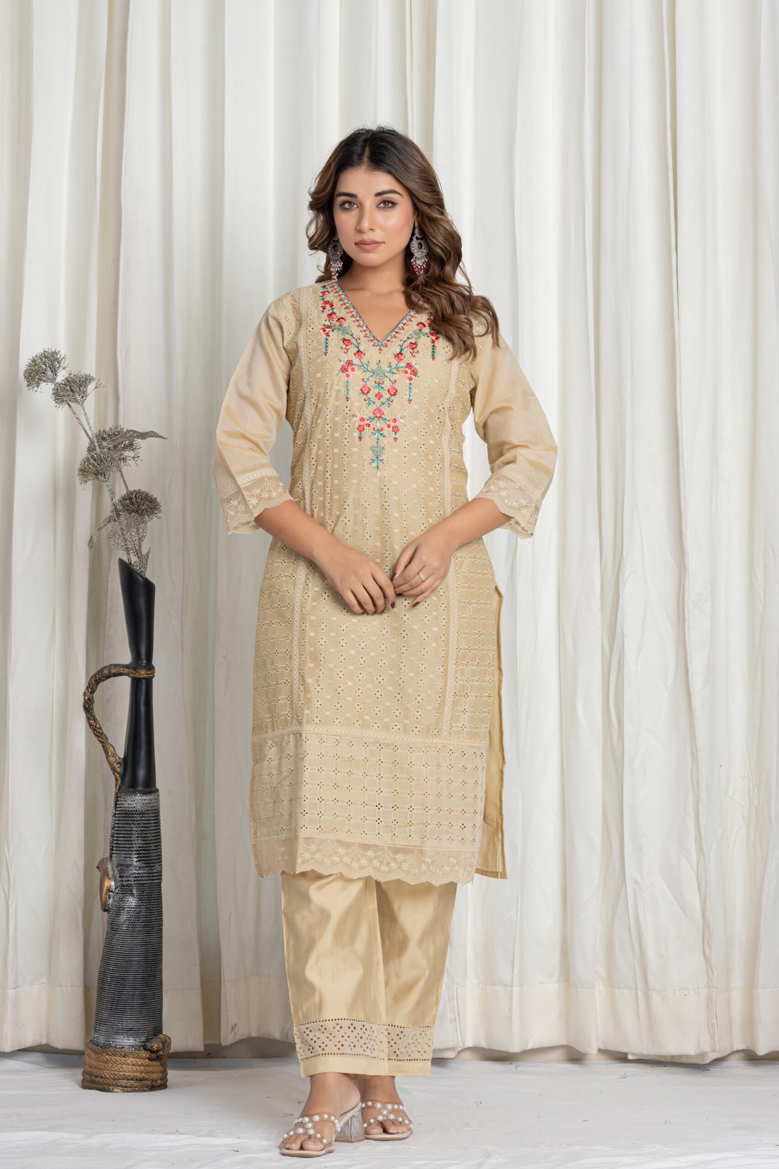 Elevate your summer style with this elegant beige cotton suit set featuring detailed chikankari embroidery and a digitally floral printed organza dupatta. Ideal for festive daytime occasions, pooja, or stylish office and daily ethnic looks.