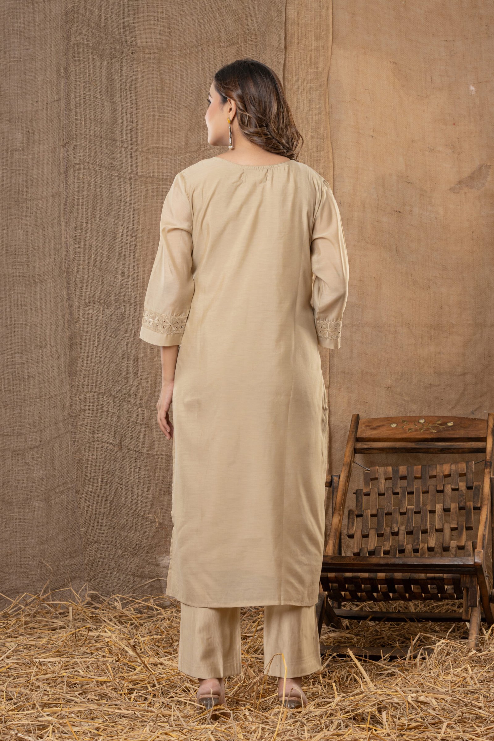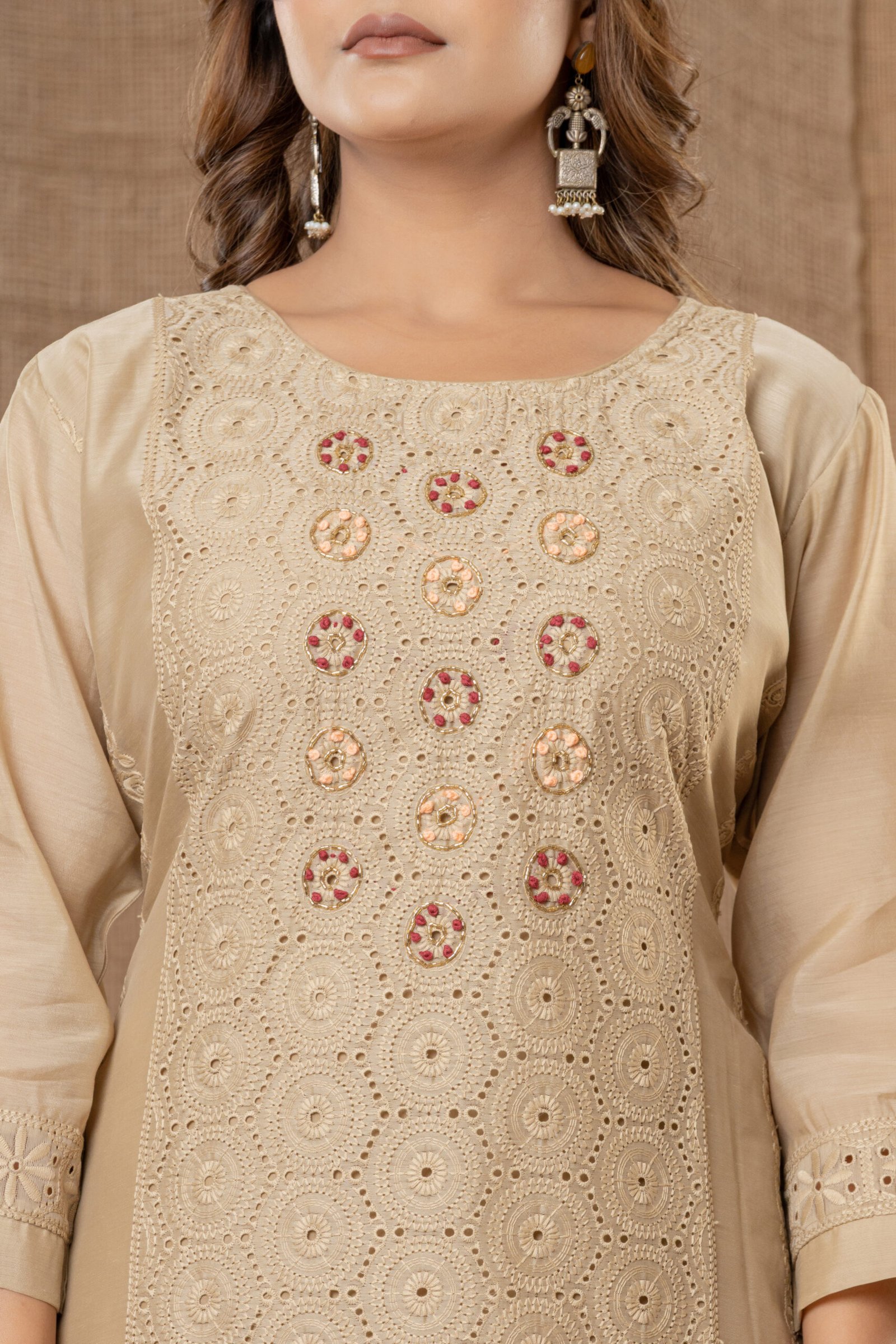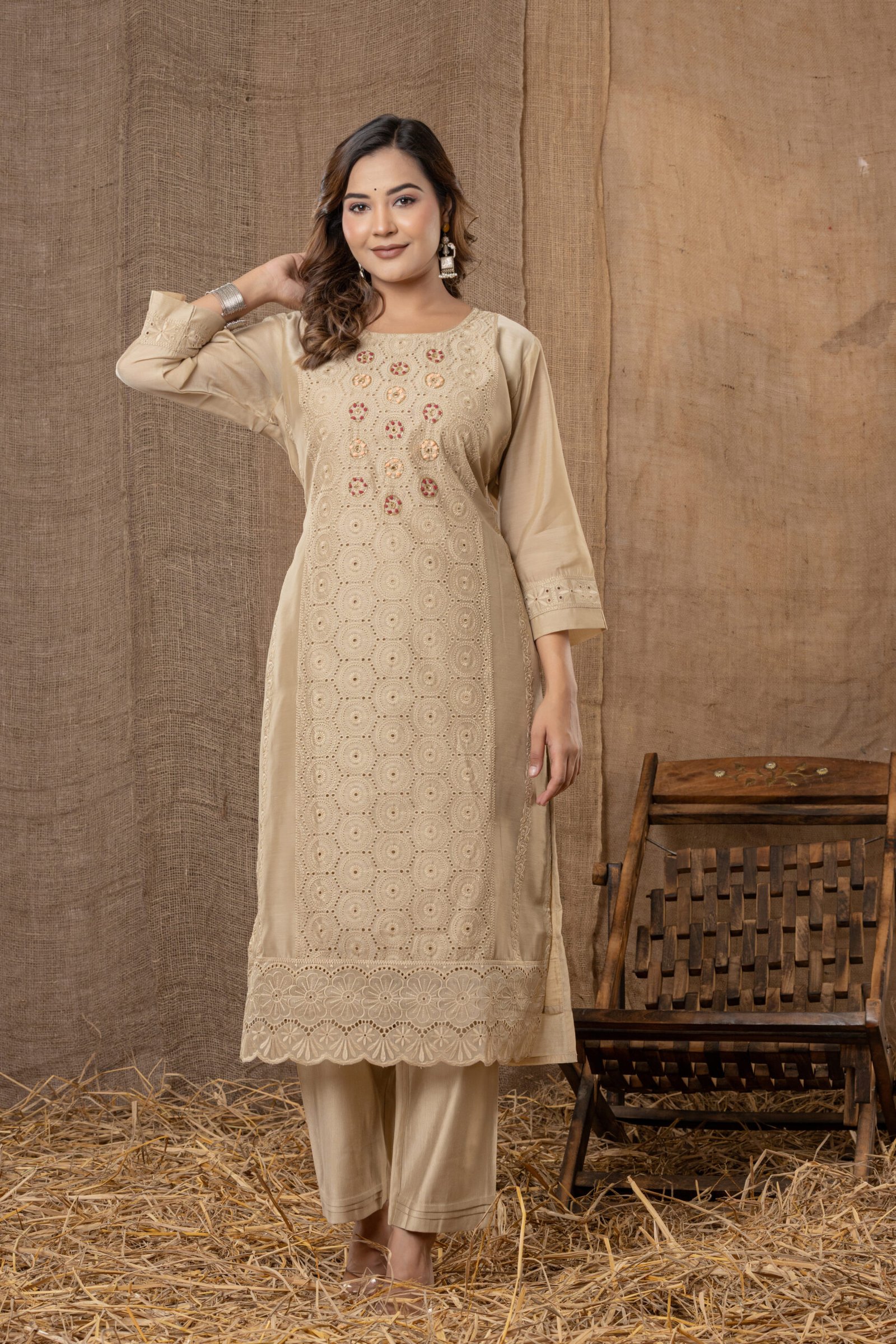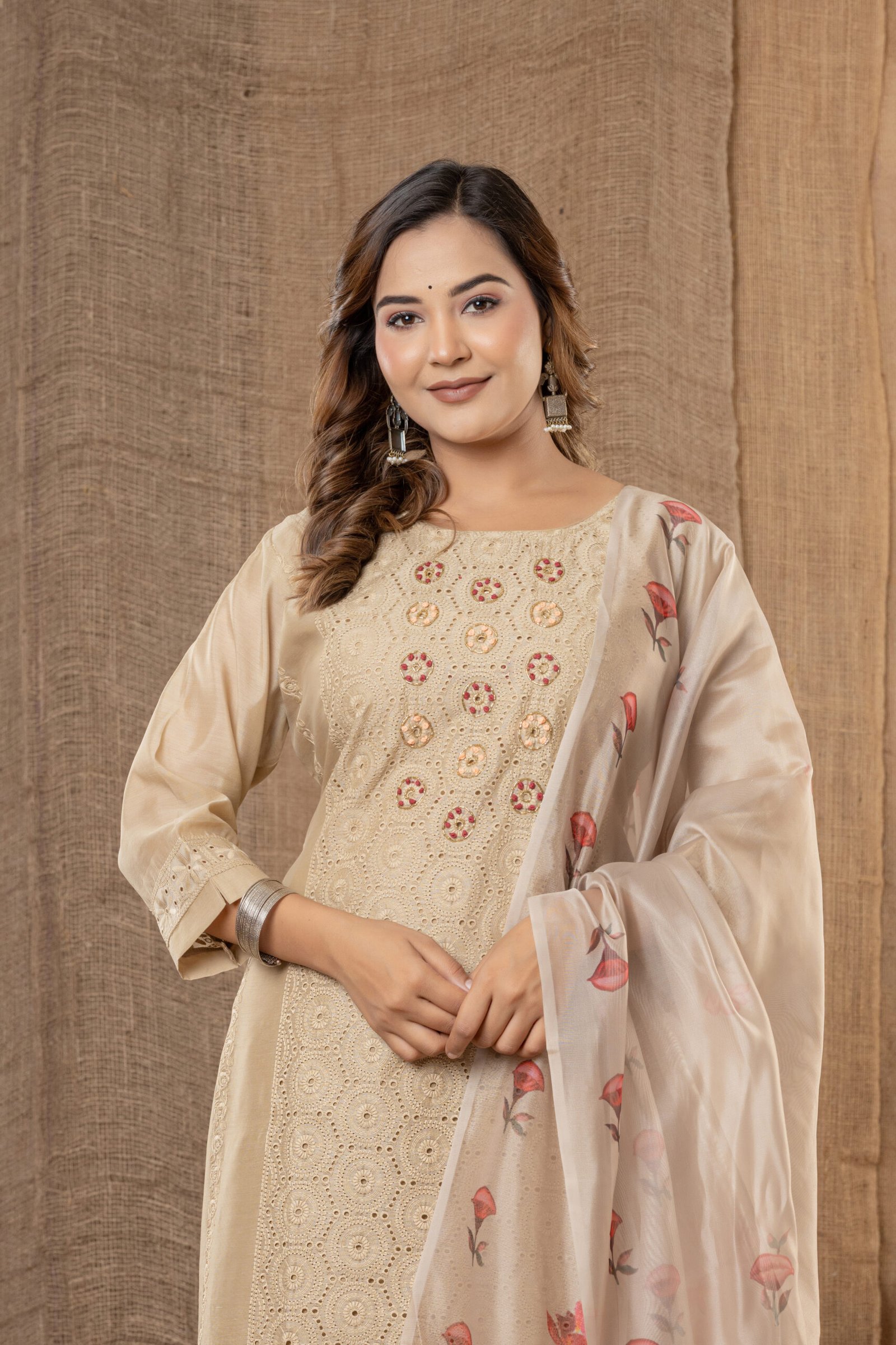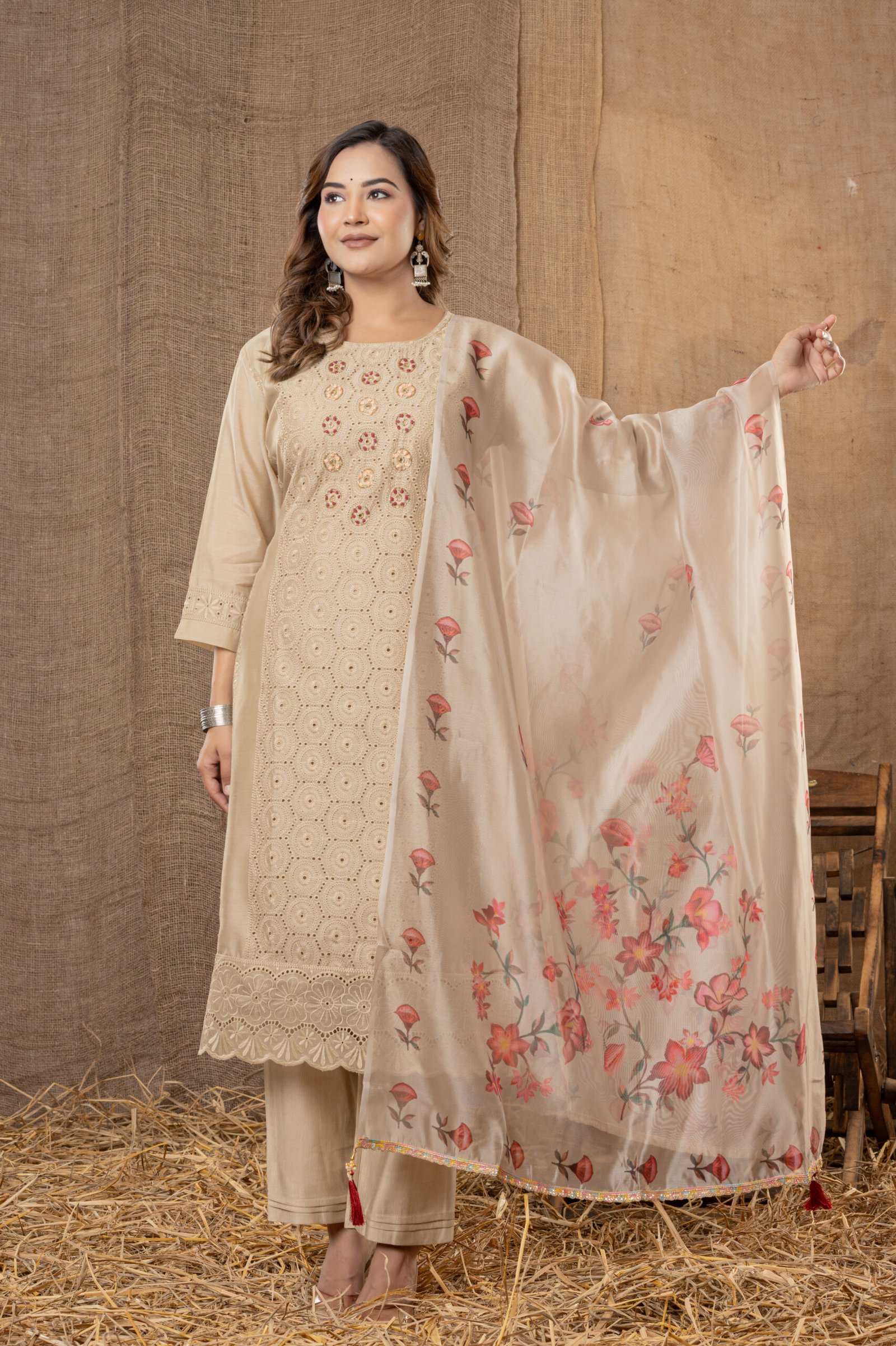 Elevate your wardrobe with this graceful beige straight kurta set designed for special occasions and daily wear. This set features a beautifully embroidered kurta in delicate circular patterns, complemented by matching trousers and a lightweight chiffon dupatta adorned with floral prints in soft pink shades. The suit offers a blend of elegance and comfort, with 3/4th sleeves, scalloped hem detailing, and a classic straight fit for a sophisticated traditional look.