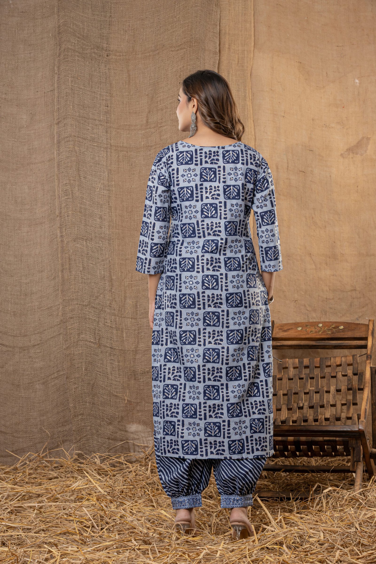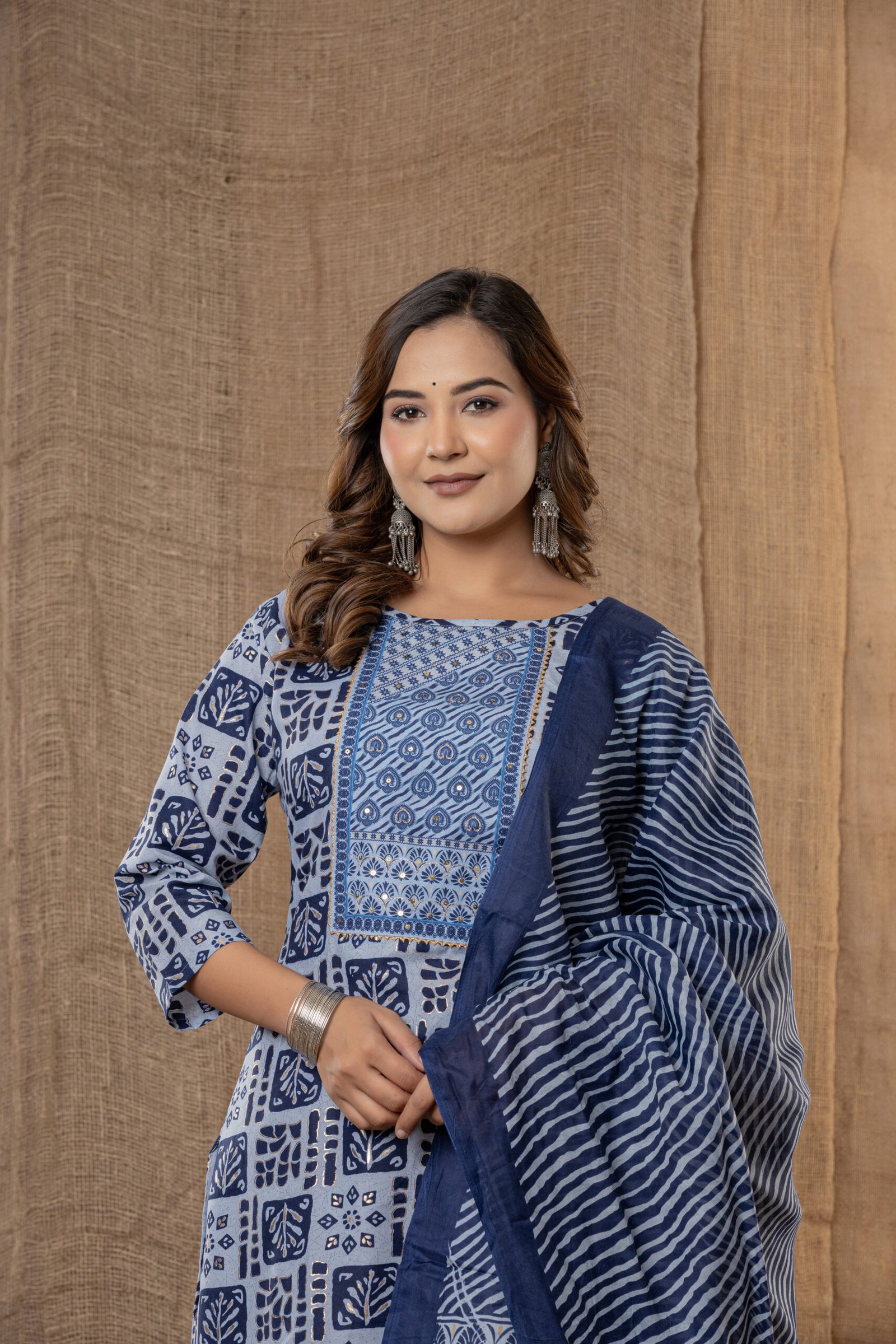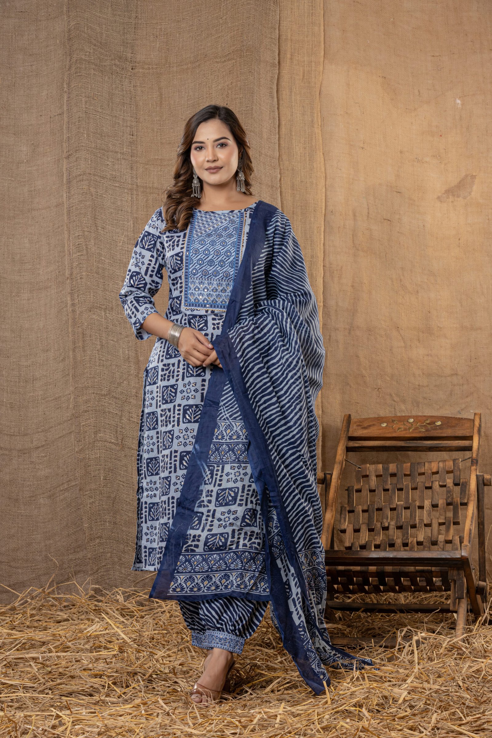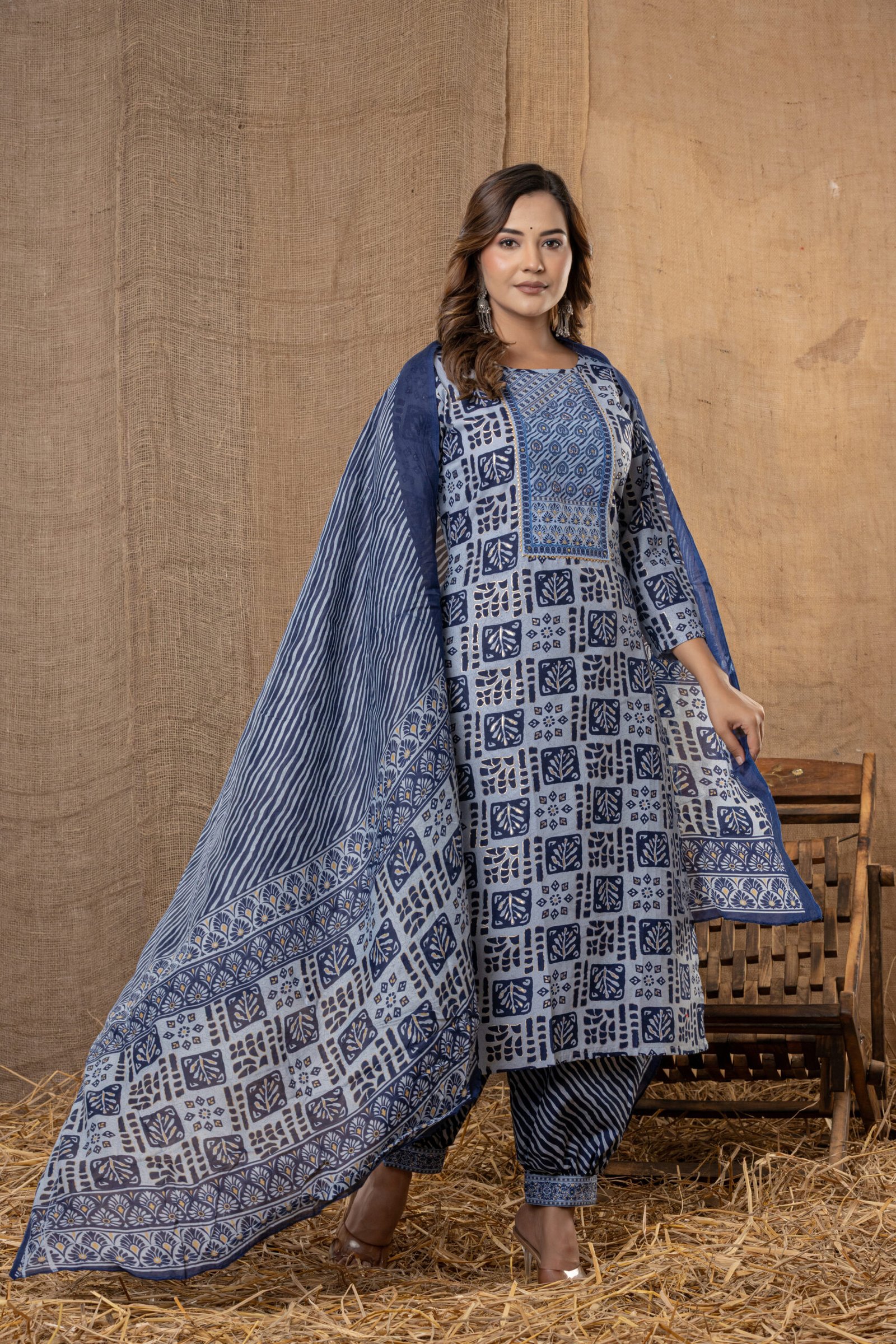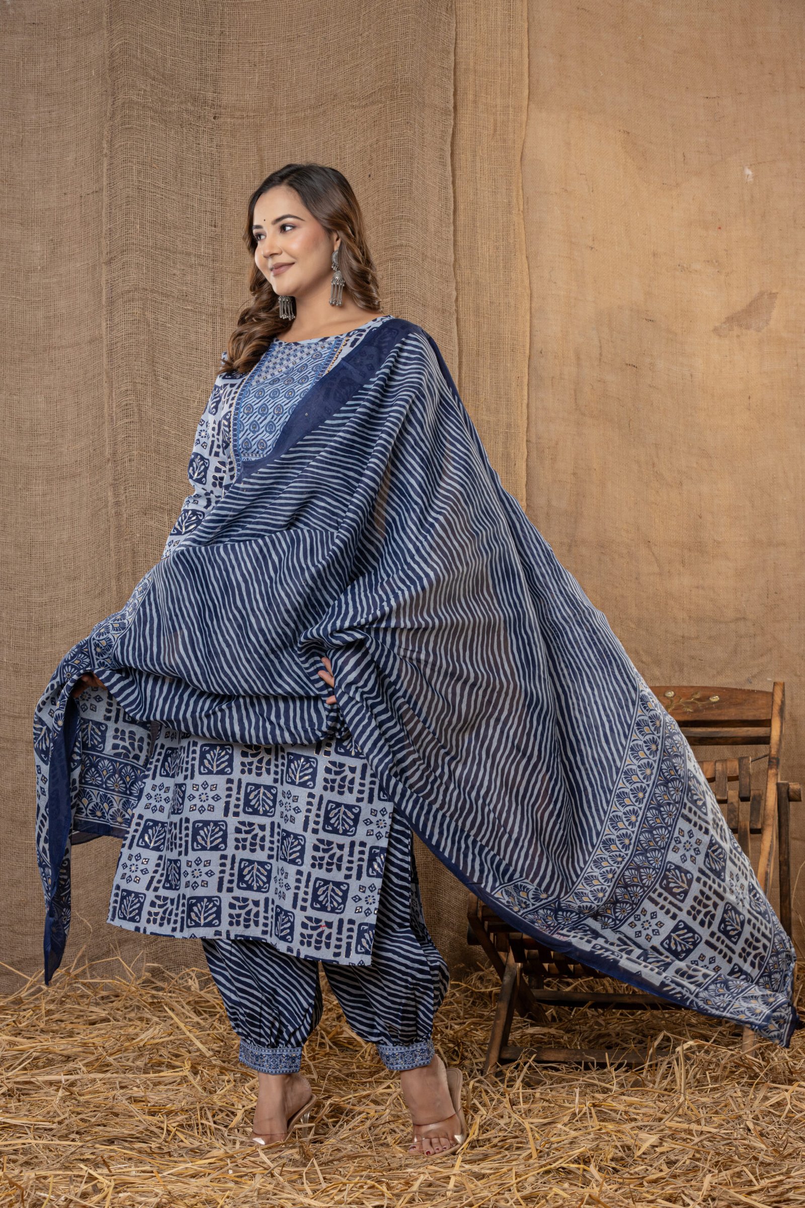 Upgrade ethnic style with this blue and cream geometric printed kurta set, perfect for festive gatherings, pooja, and everyday Indian wear. This three-piece ensemble features a straight kurta with bold modern block prints, comfortable patiala pants with wavy stripes, and a coordinated printed dupatta for a complete fashionable look.
