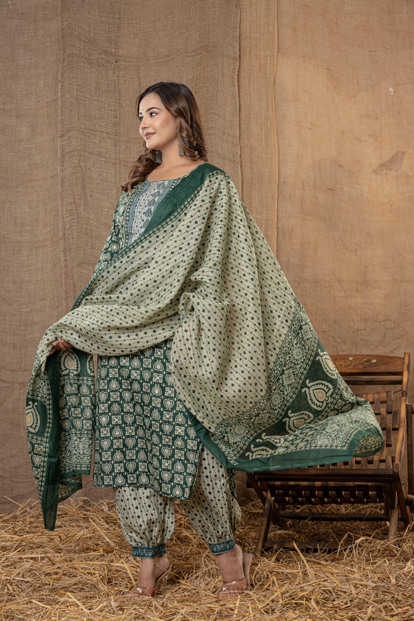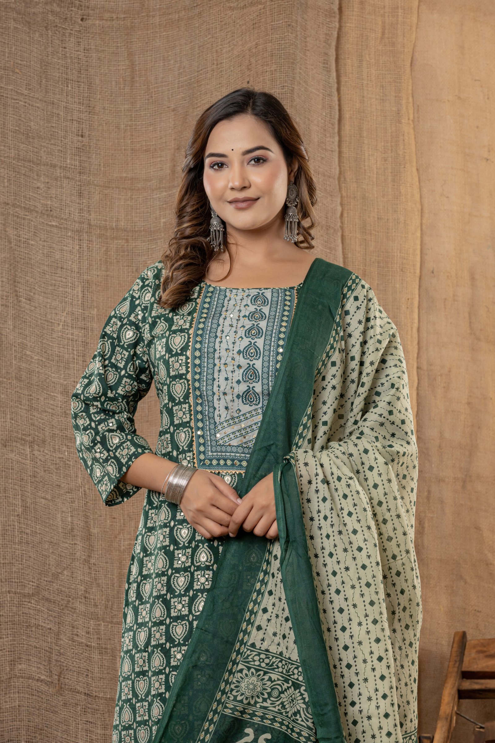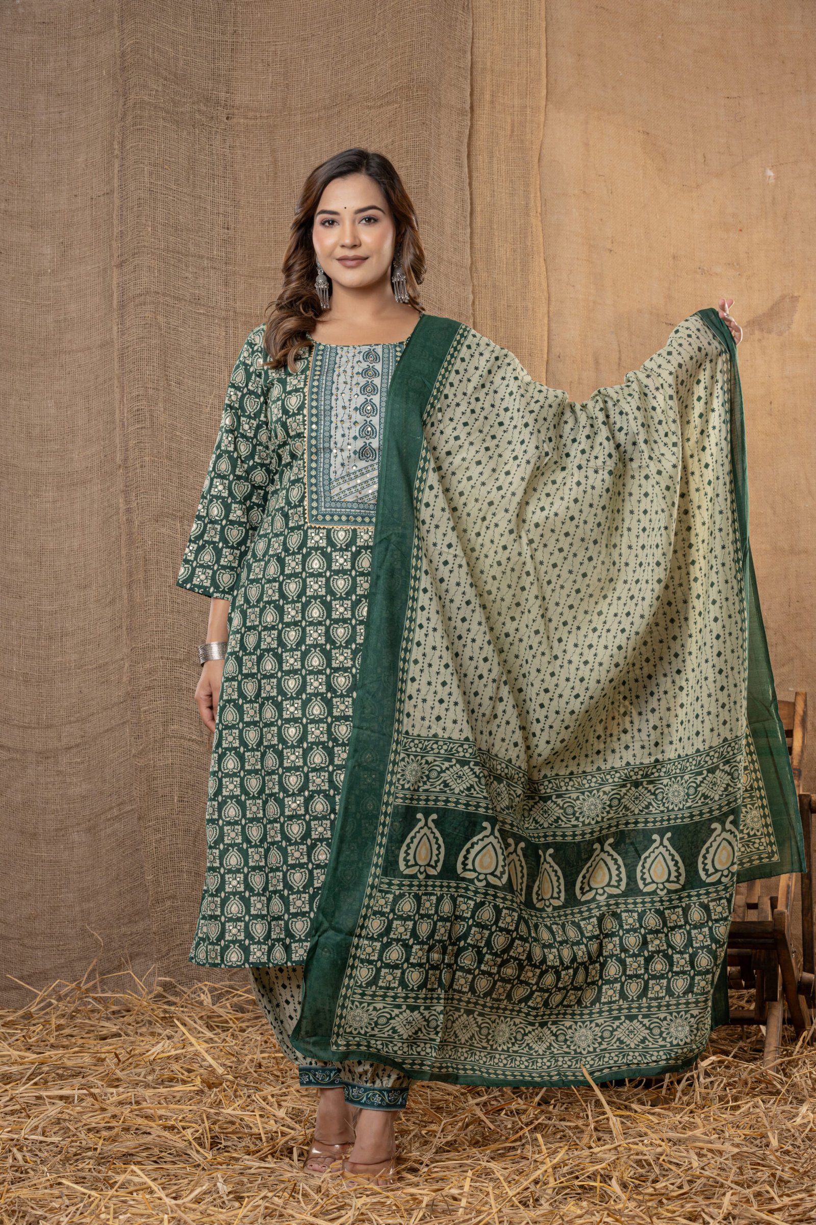 Bring elegance and tradition together with this charming dark green printed kurta set, perfect for festive occasions, pujas, or everyday ethnic style. This three-piece ensemble includes a straight dark green kurta with beautiful block-inspired prints, a coordinated light green patiala pant, and a matching dupatta for a complete ethnic look.