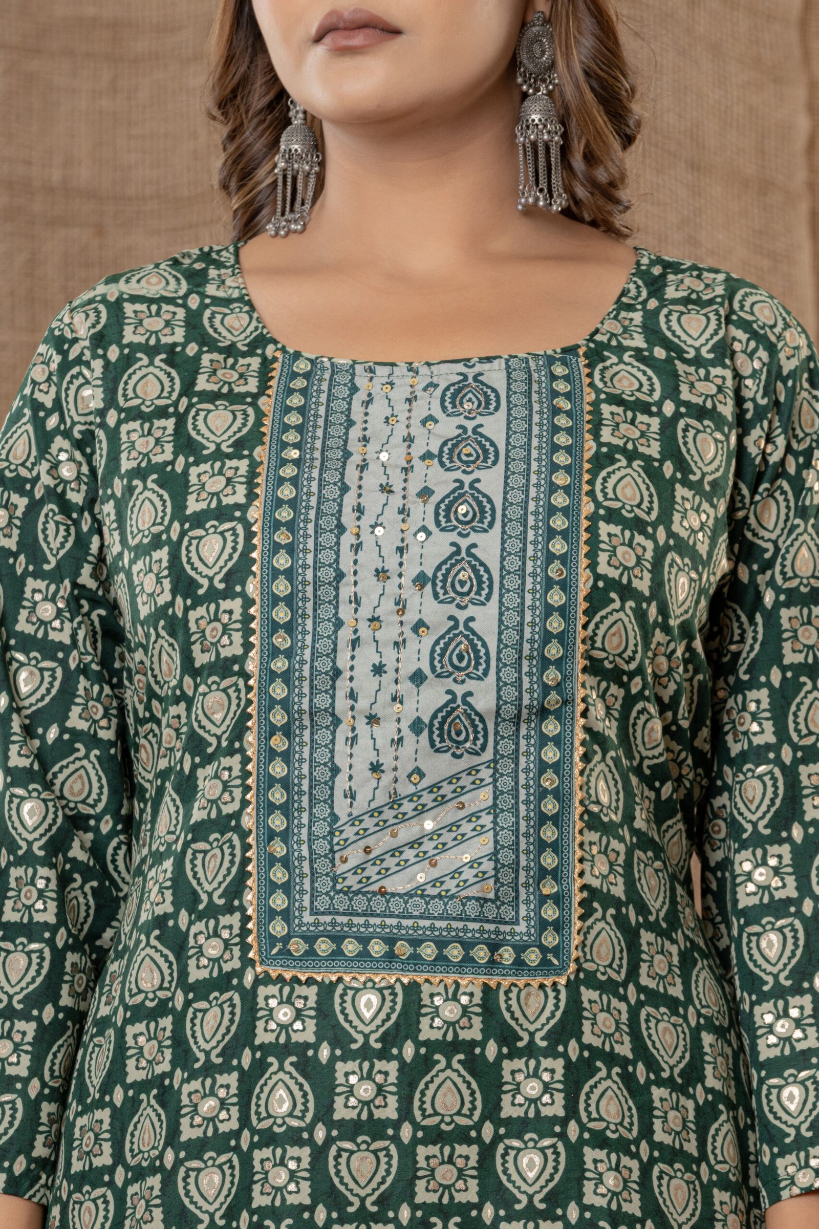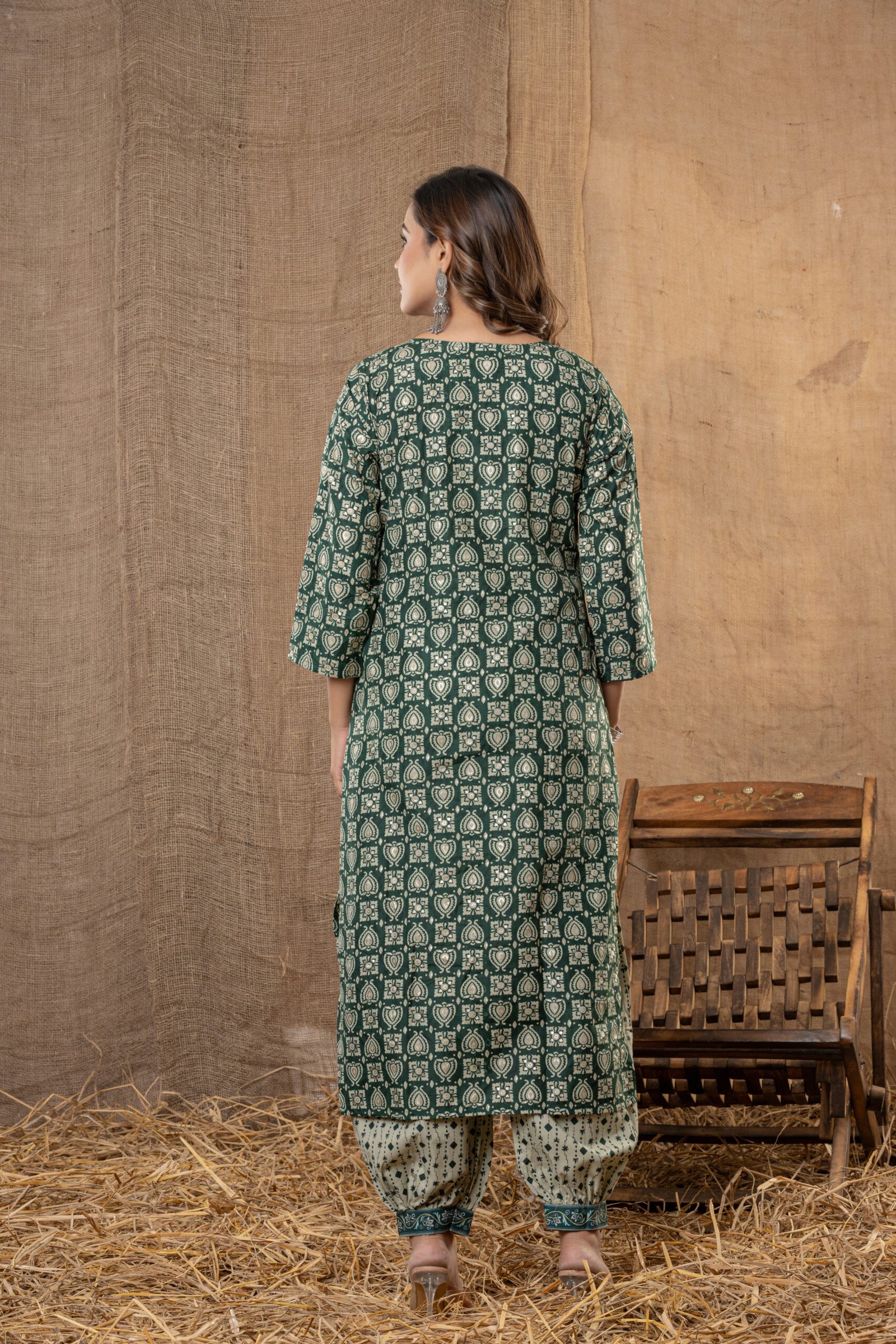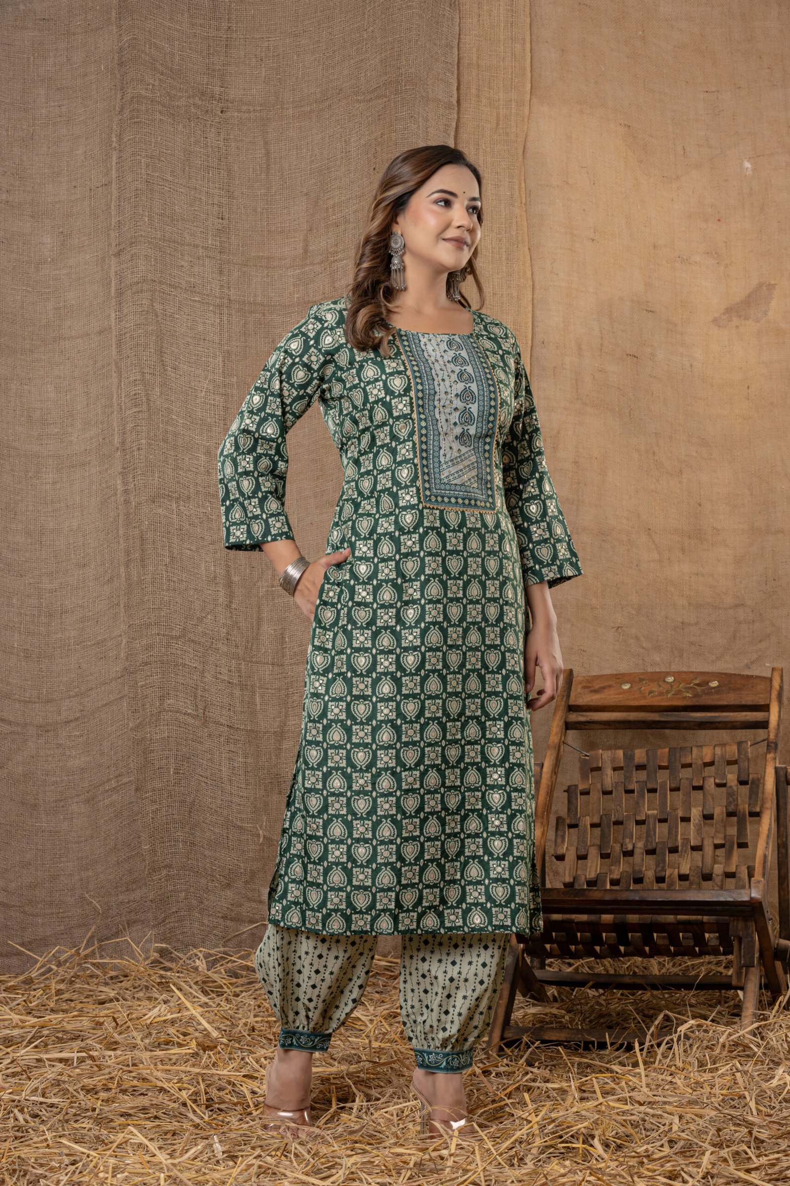 Bring elegance and tradition together with this charming dark green printed kurta set, perfect for festive occasions, pujas, or everyday ethnic style. This three-piece ensemble includes a straight dark green kurta with beautiful block-inspired prints, a coordinated light green patiala pant, and a matching dupatta for a complete ethnic look.