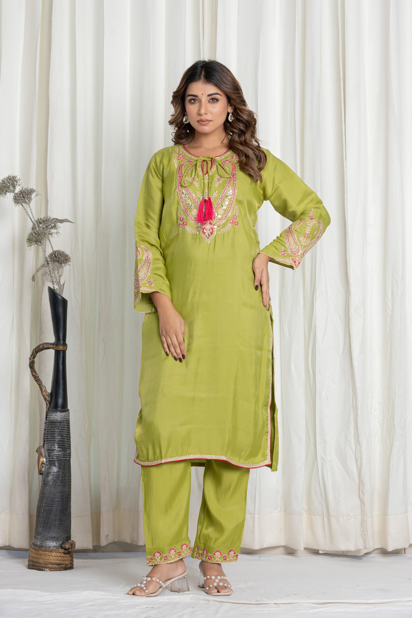 Add a fresh, elegant look to your ethnic wardrobe with this pistachio green silk kurta set, beautifully adorned with intricate multicolor embroidery and a vibrant Banarasi woven dupatta. This 3-piece ensemble is ideal for festive events, haldi/pooja ceremonies, or statement daytime gatherings.