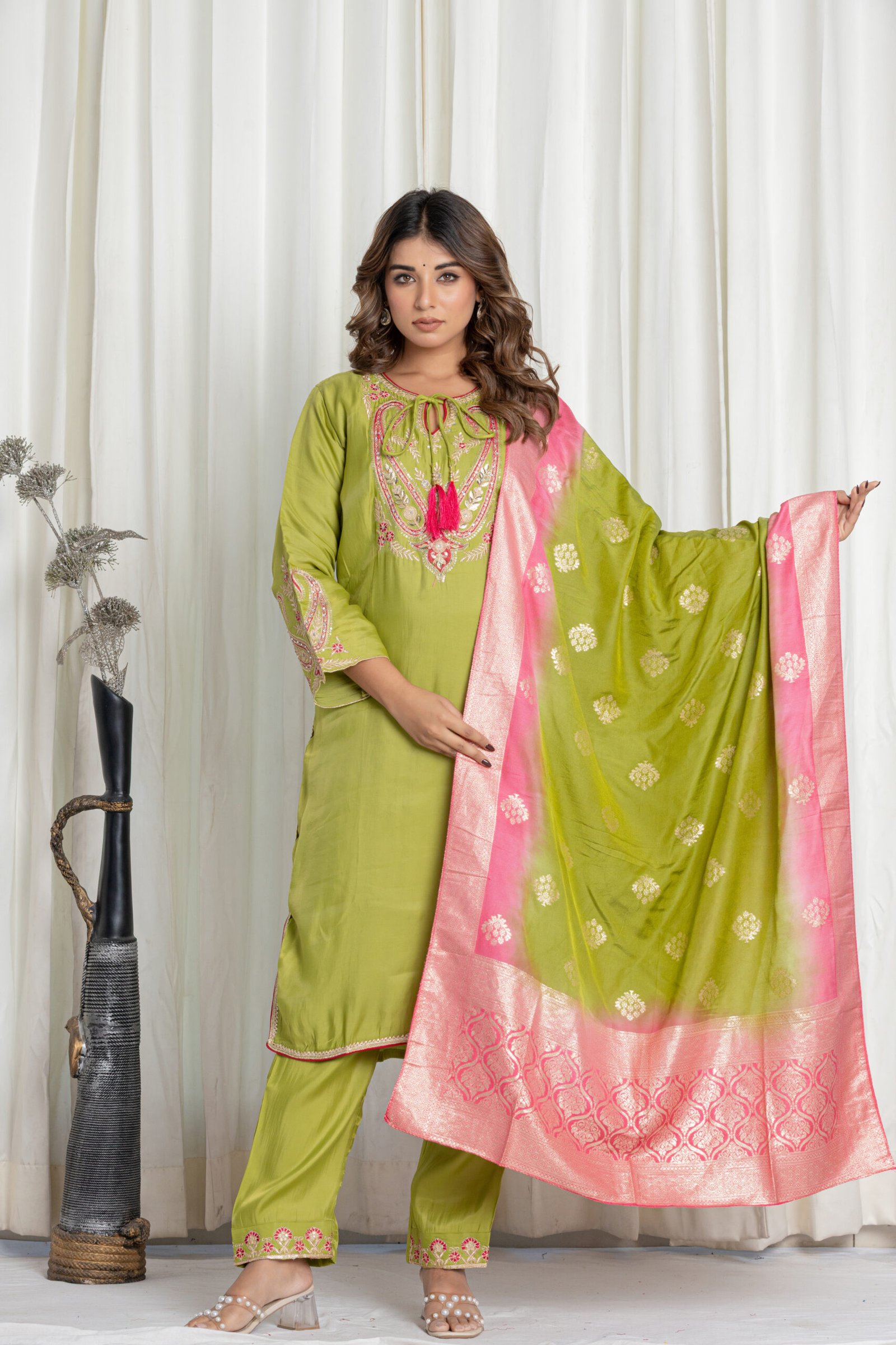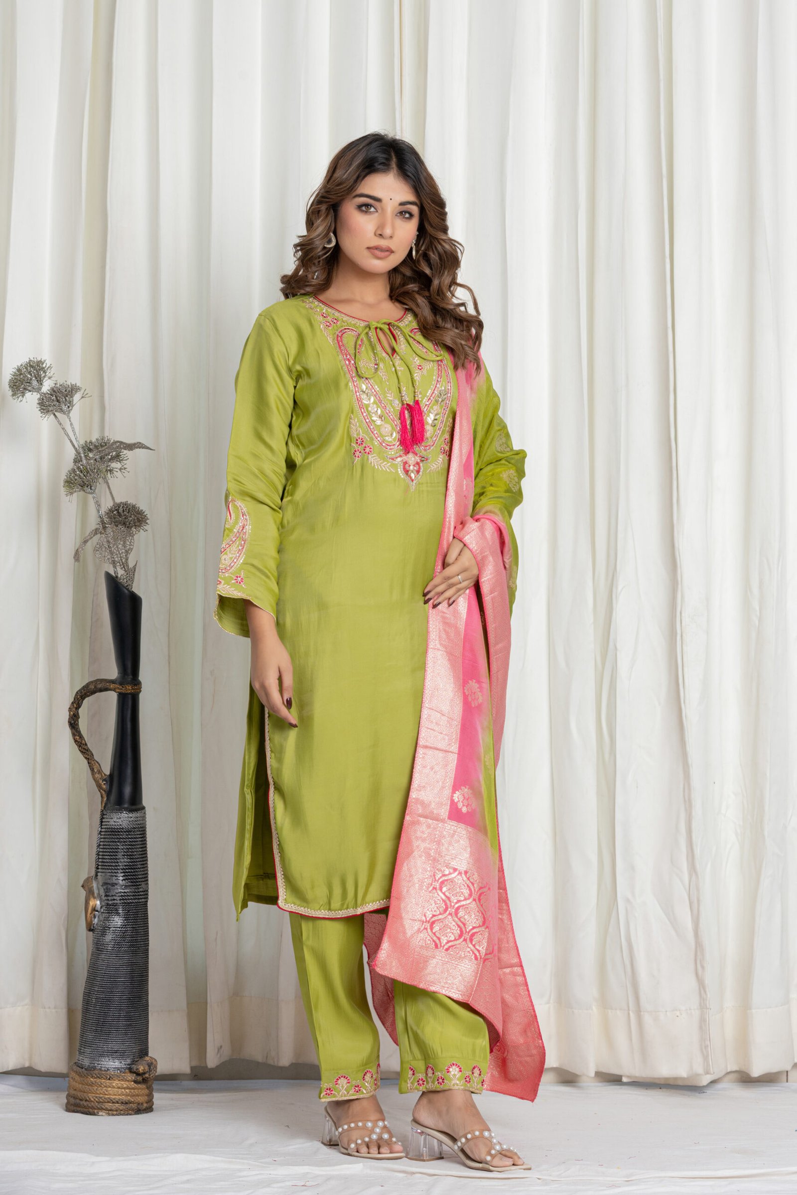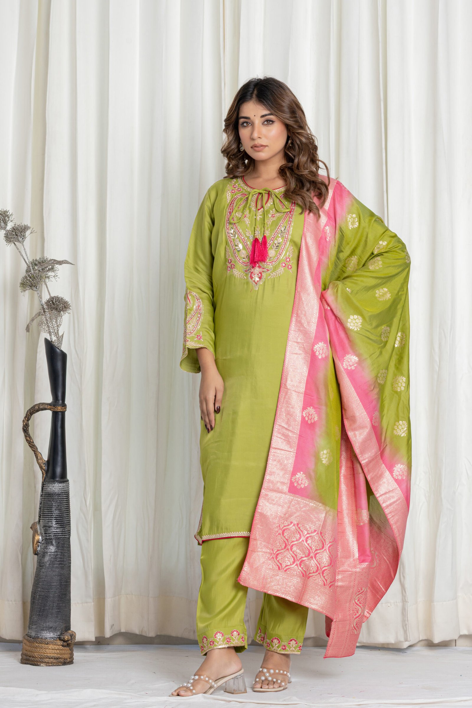 Be the first to review “Women’s Green Embroidered Silk Kurta Set with Banarasi Pink-Green Dupatta”