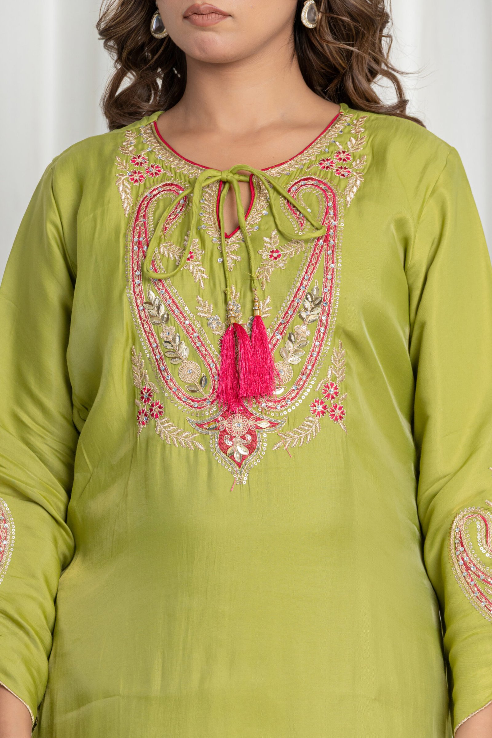 • Neckline: Trendy round-tie neck with dori and statement tassel detailing