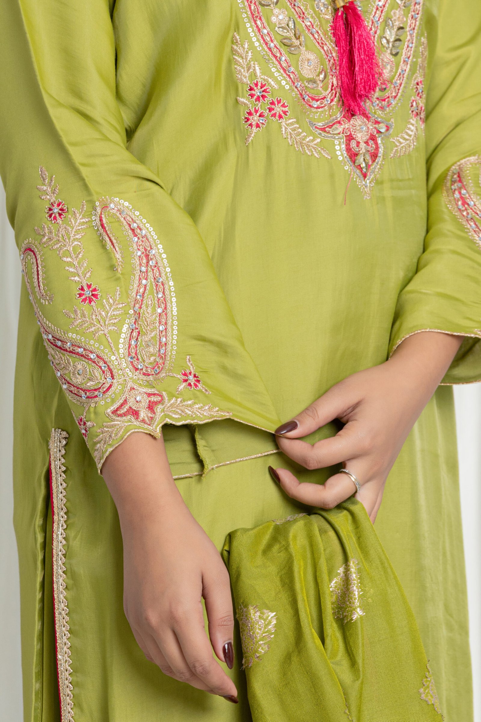 • Sleeves: 3/4th with matching embroidery on borders