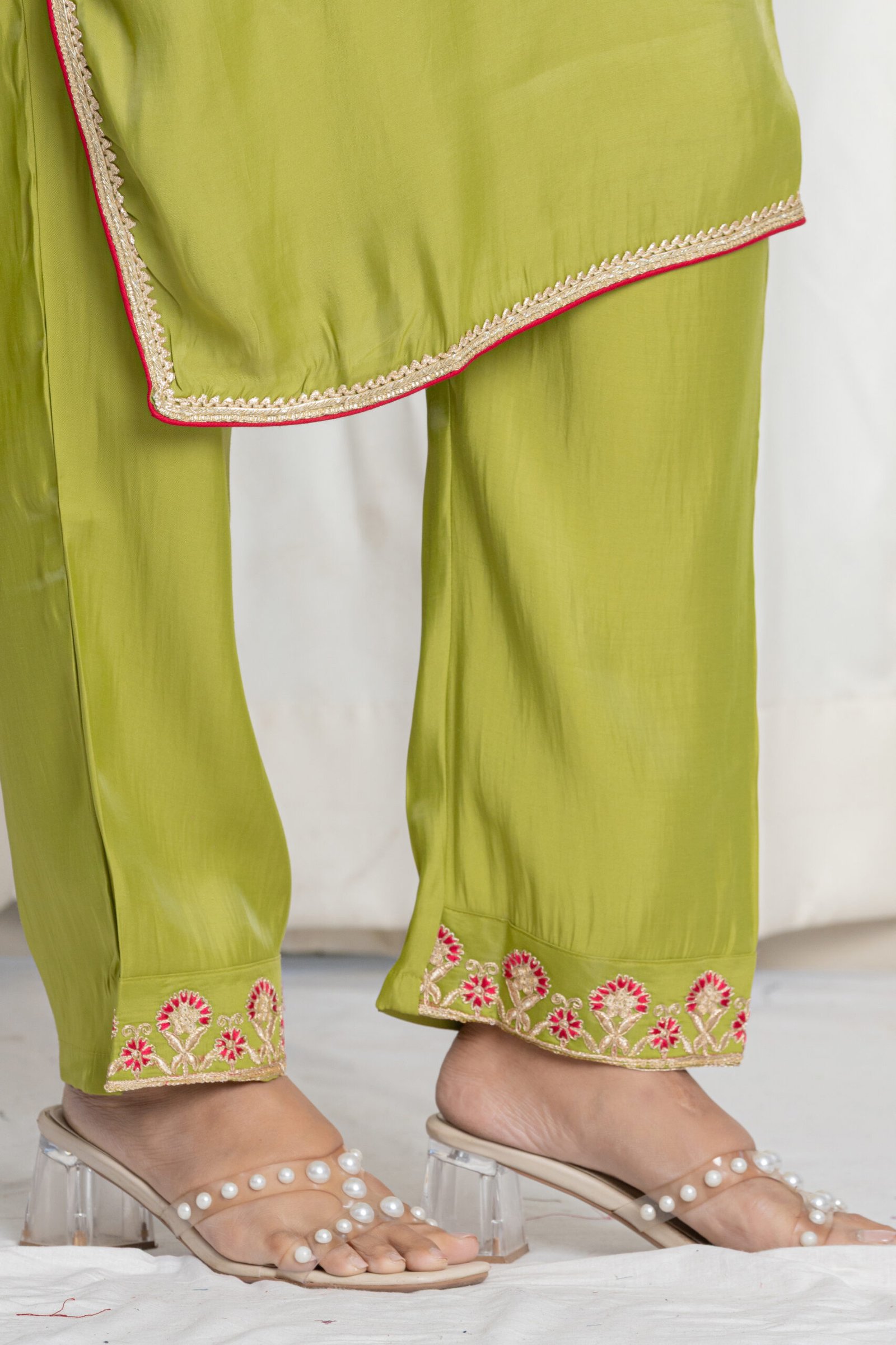 • Embroidery: Delicate pastel work across ankle hem for subtle festive detail