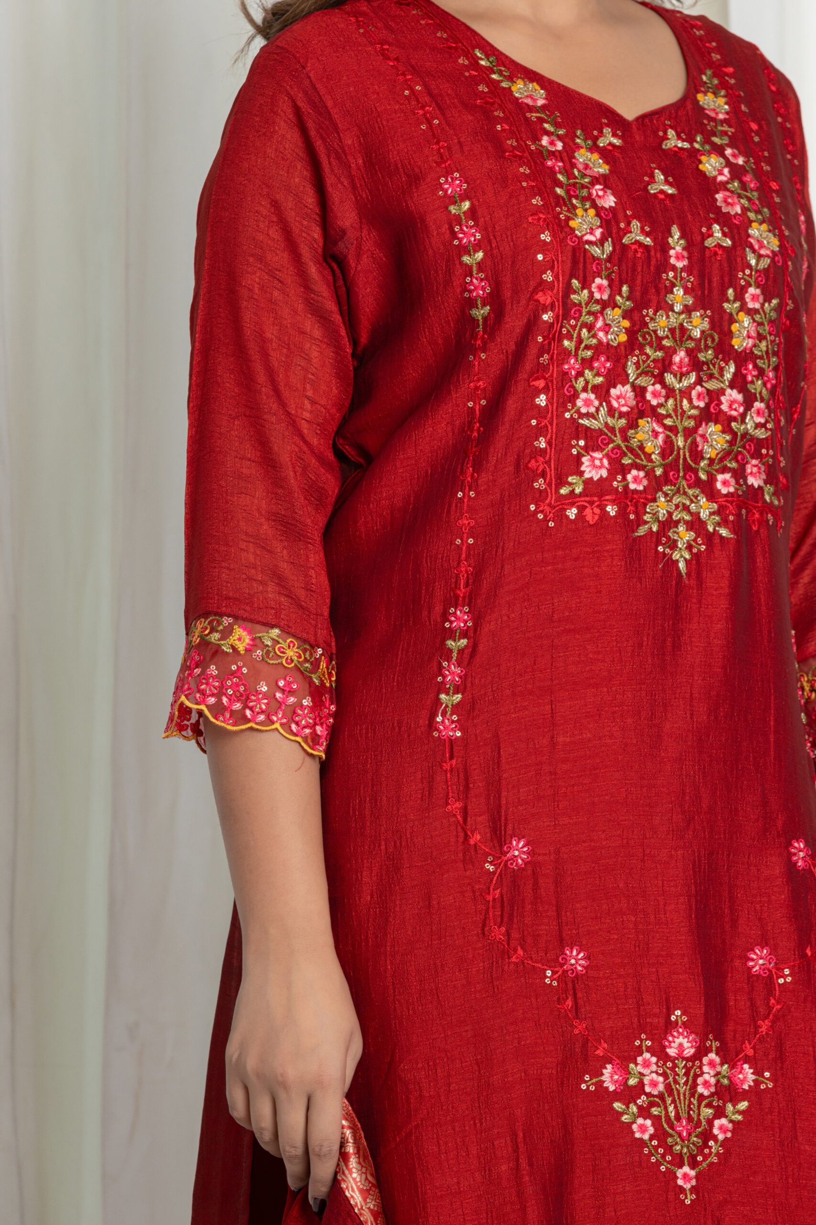 Step into celebrations with this vibrant maroon kurta sharara set featuring intricate multi-colour floral thread embroidery and a designer georgette dupatta. This 3-piece festive set offers a perfect fusion of tradition and modern party style—ideal for weddings, sangeet, pooja functions, and upscale ethnic gatherings.