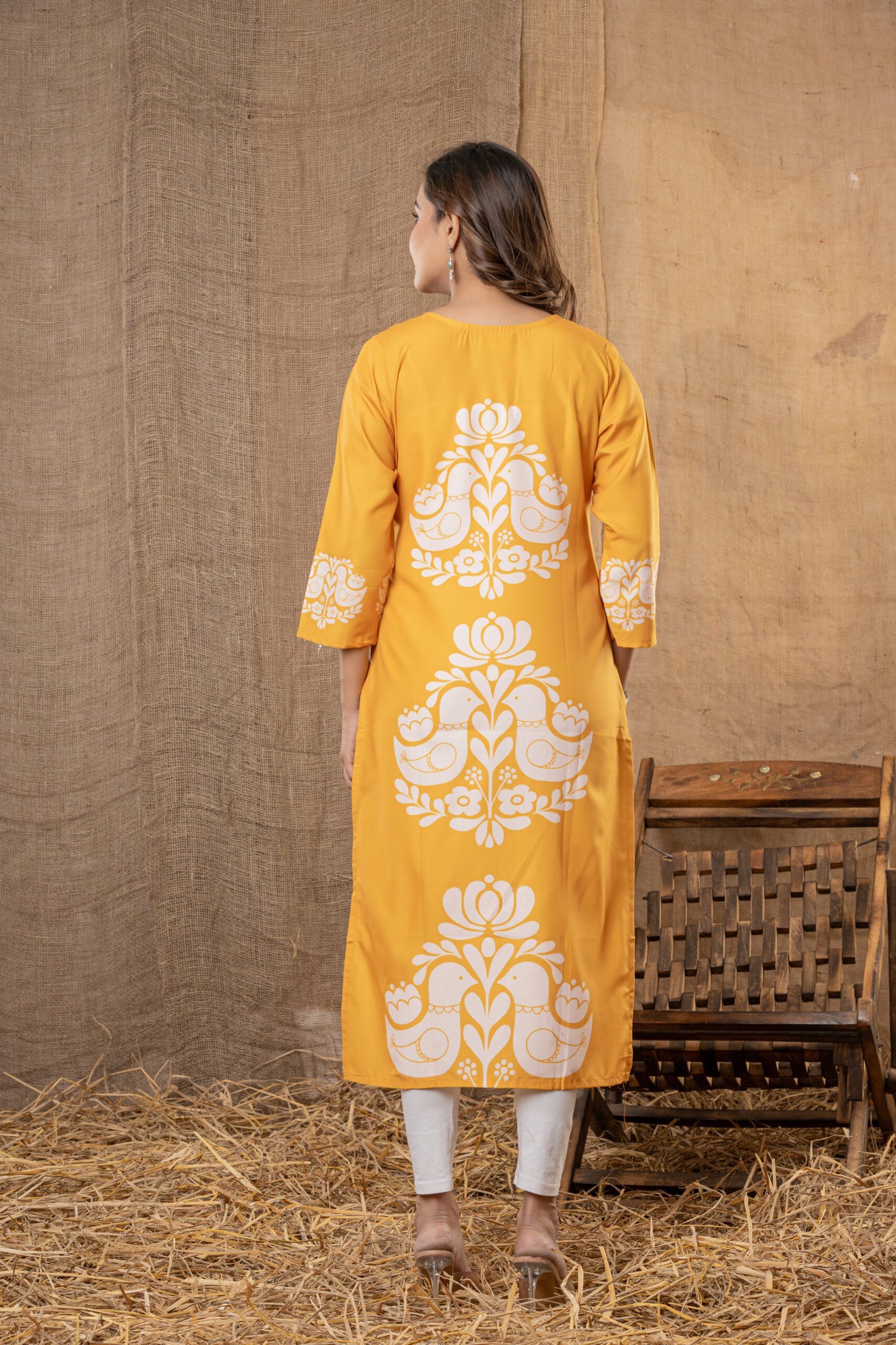 Design: Elegant detailed prints with ornamental motifs along the hemline and sleeves