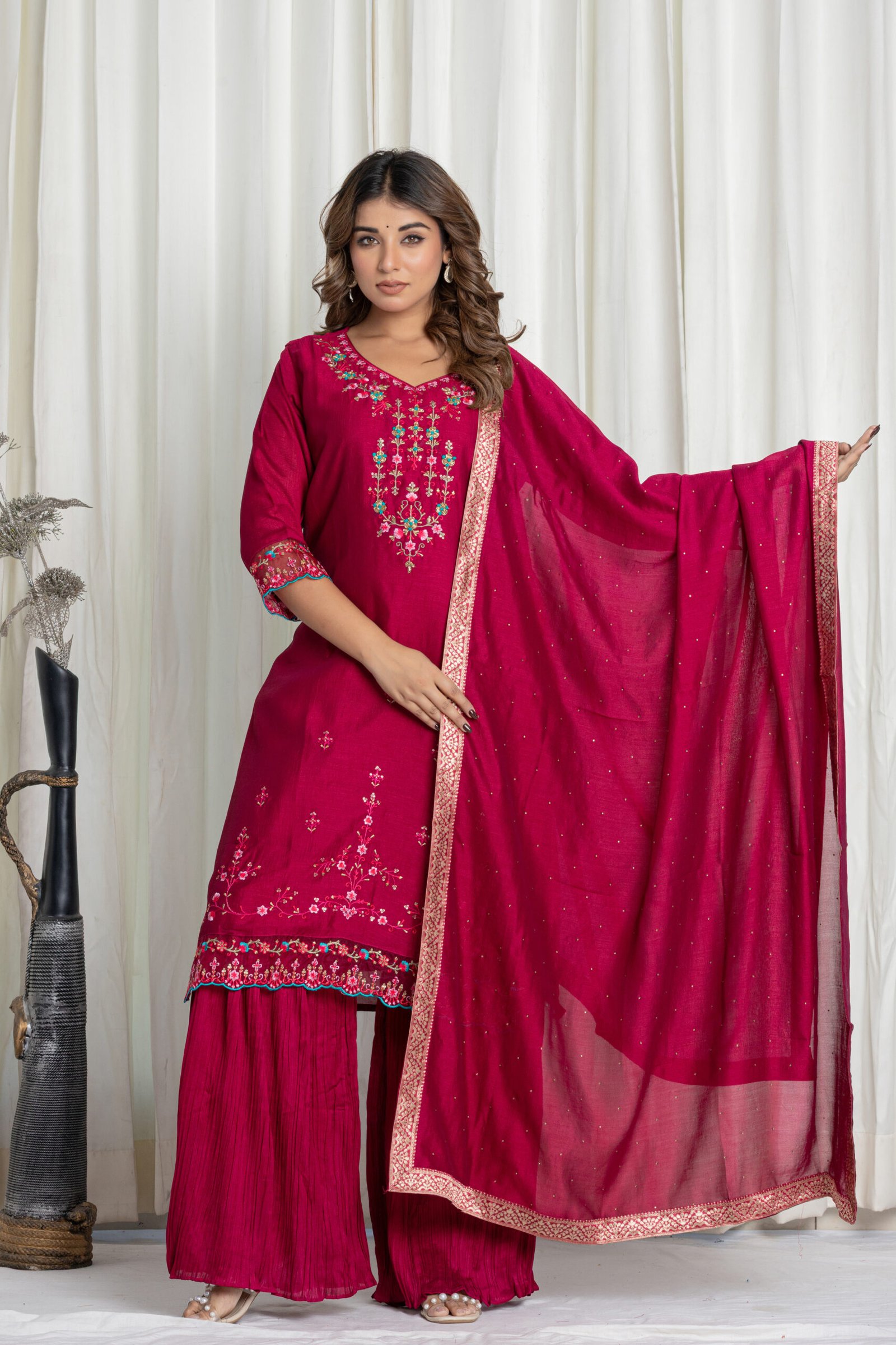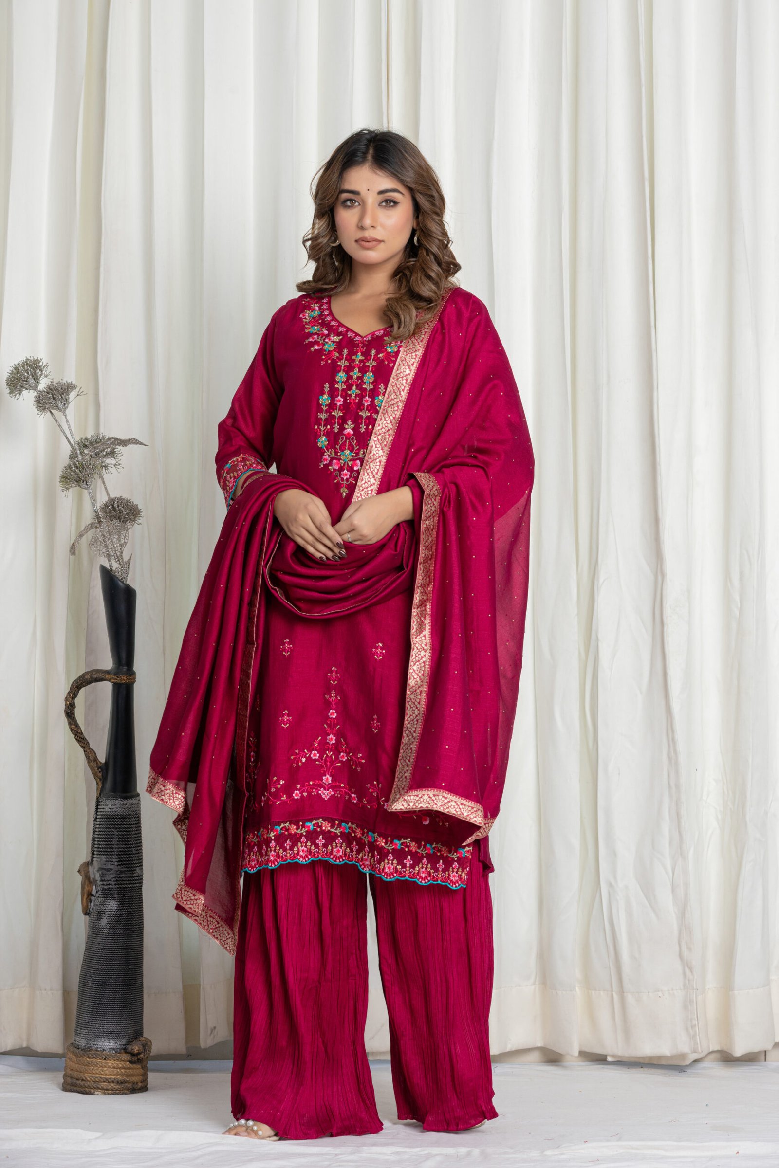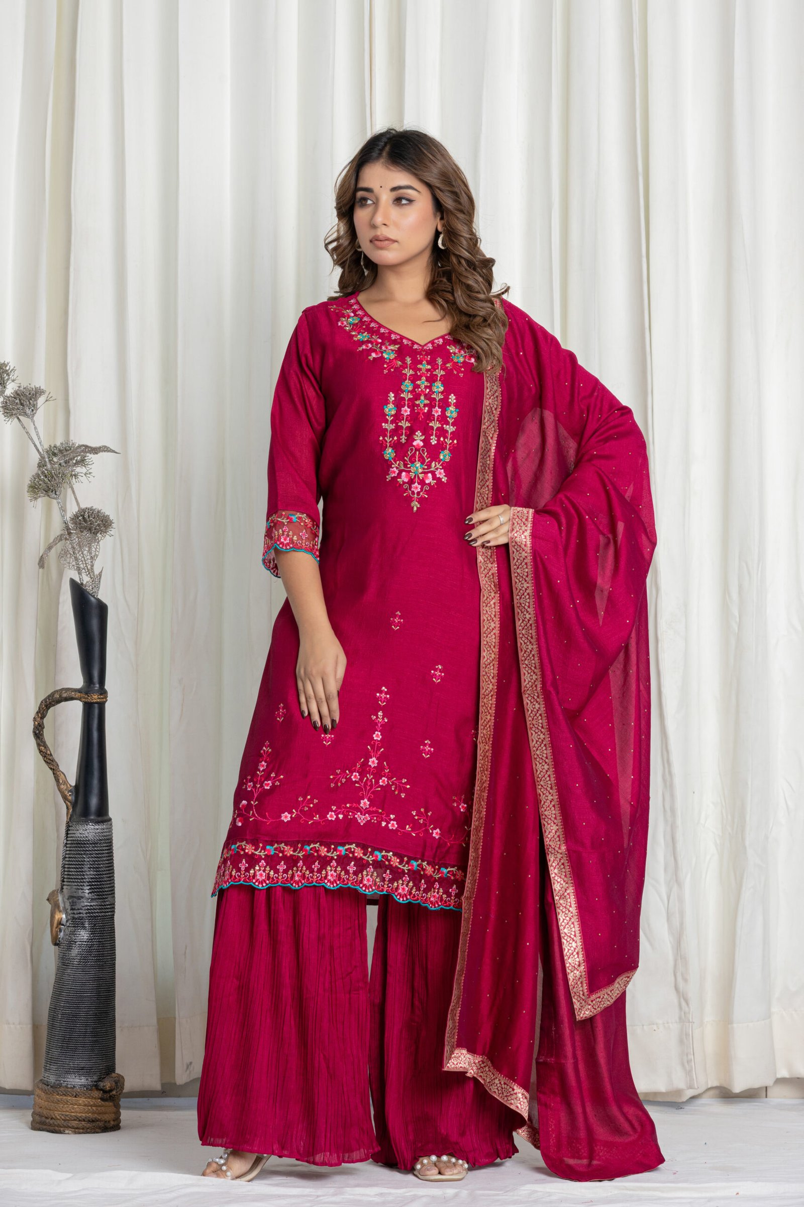 Add a splash of festive color with this vibrant pink georgette kurta sharara set, adorned with multicolor floral embroidery and statement net sleeve cuffs. Perfect for celebration, pooja, weddings, and modern ethnic gatherings, this 3-piece set combines bold style and traditional craftsmanship.