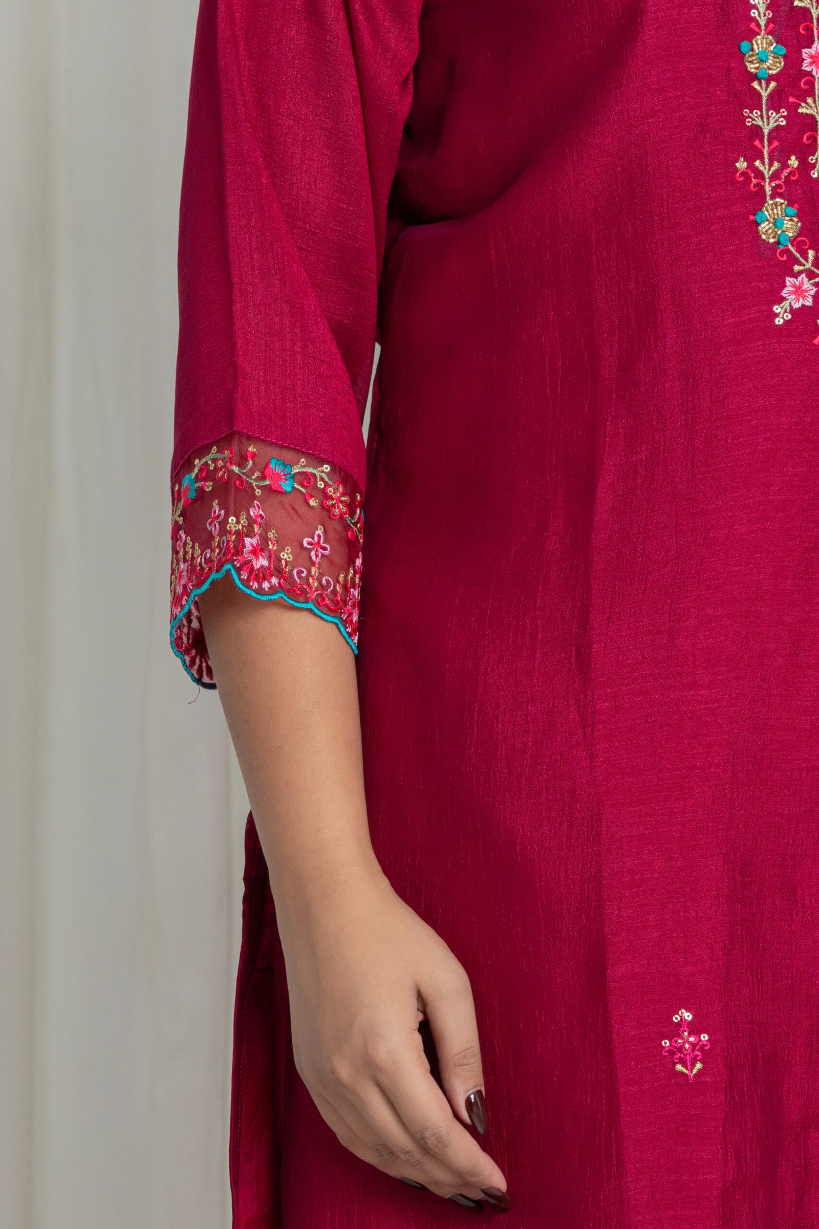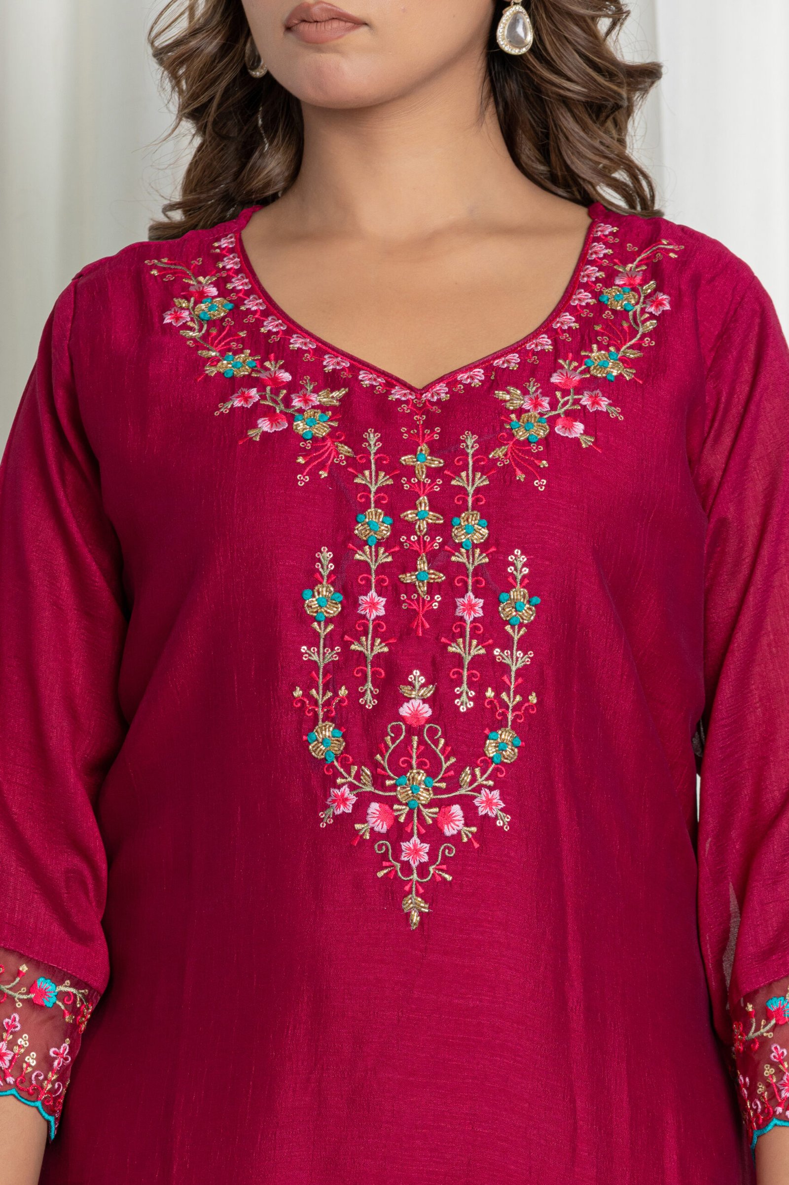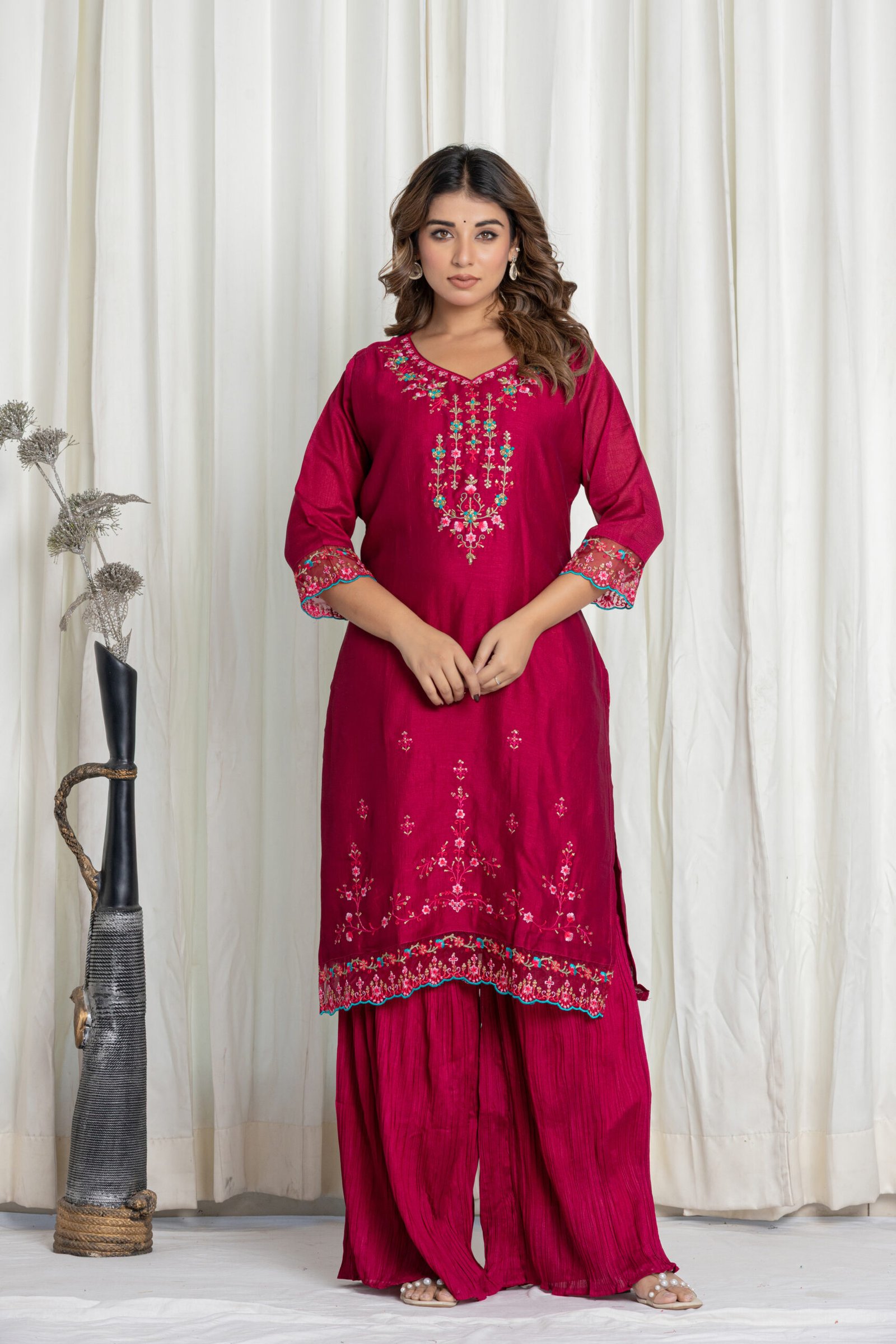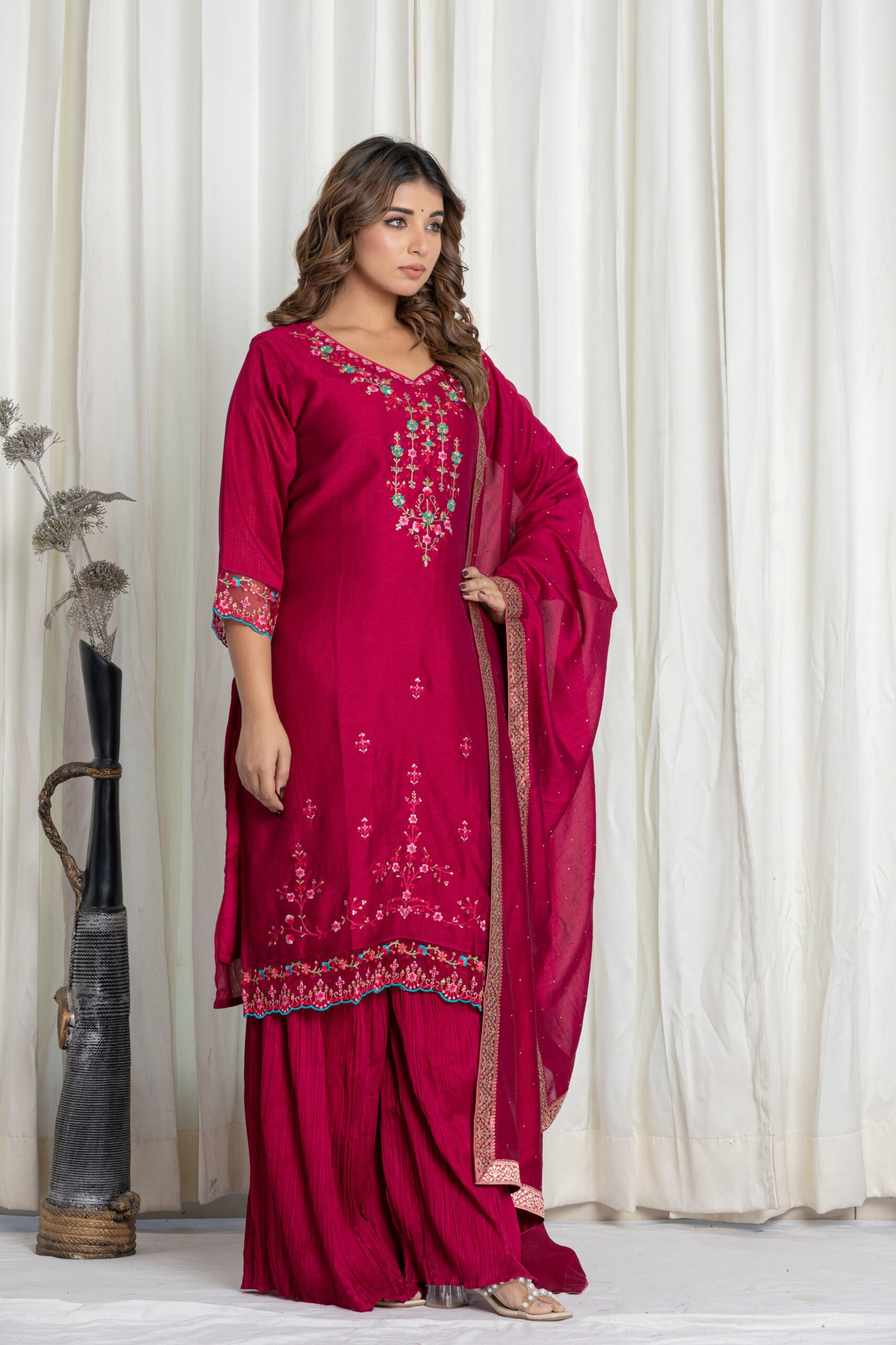 Add a splash of festive color with this vibrant pink georgette kurta sharara set, adorned with multicolor floral embroidery and statement net sleeve cuffs. Perfect for celebration, pooja, weddings, and modern ethnic gatherings, this 3-piece set combines bold style and traditional craftsmanship.