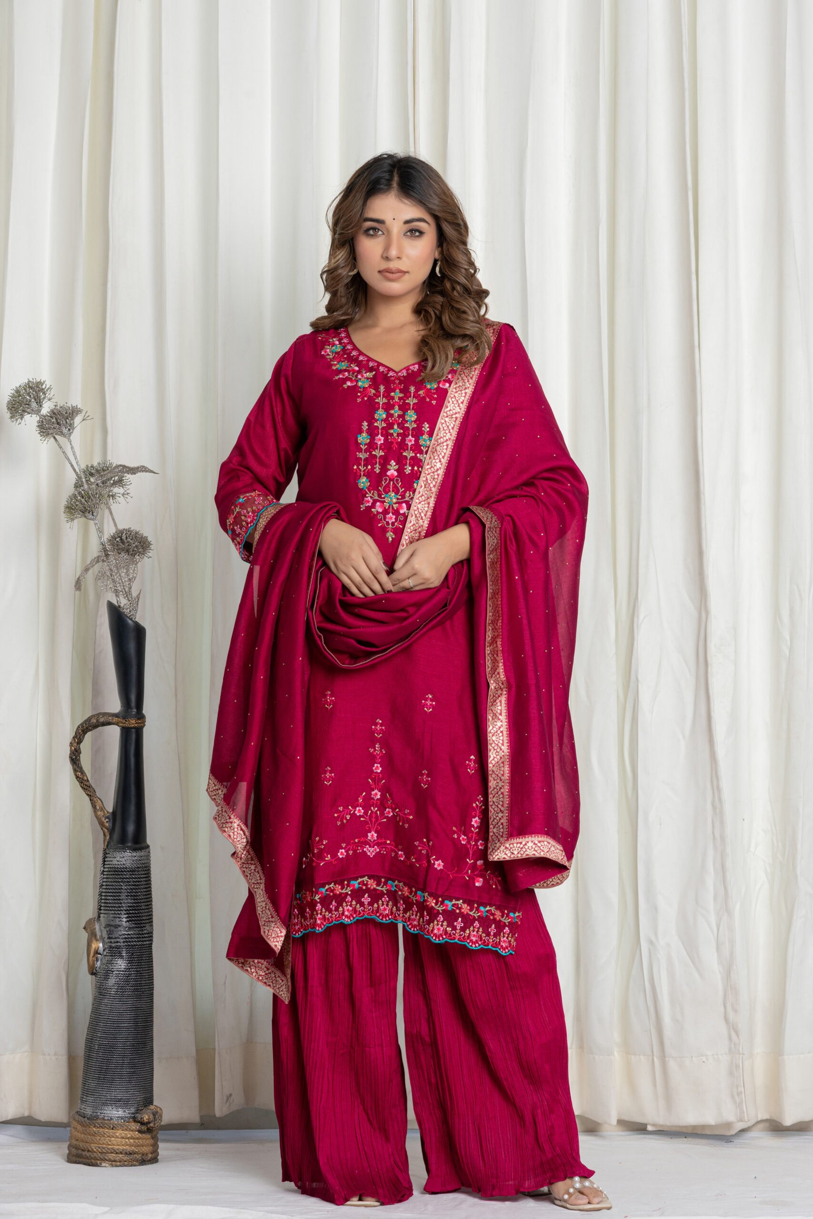 1 Embroidered Kurta, 1 Sharara Pant, 1 Embroidered Dupatta