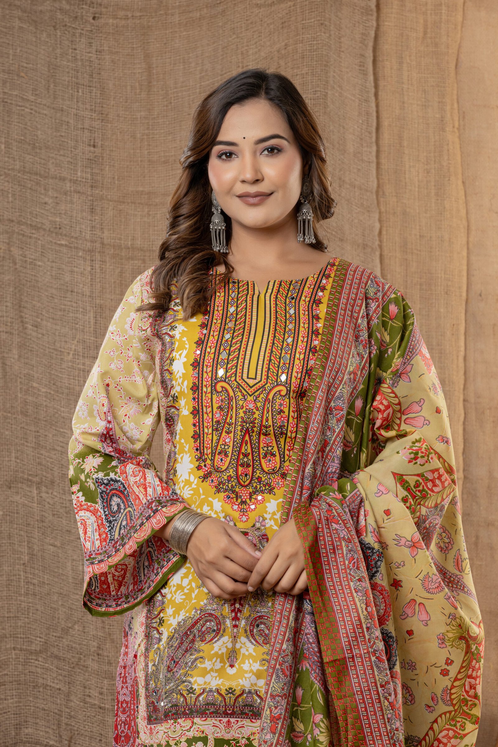 Embrace vibrant ethnic style with this striking yellow and olive green kurta set, designed to stand out for festive celebrations, family gatherings, or elegant daywear. This three-piece set features a heavily detailed ethnic print kurta, solid olive pants, and a complementary digital printed dupatta with multicolour motifs.