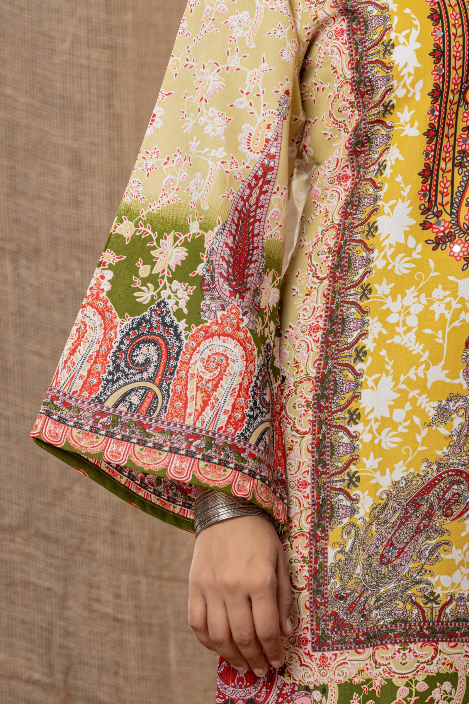 • Colour: Olive green & yellow base with bold, vivid ethnic prints and elegant borders