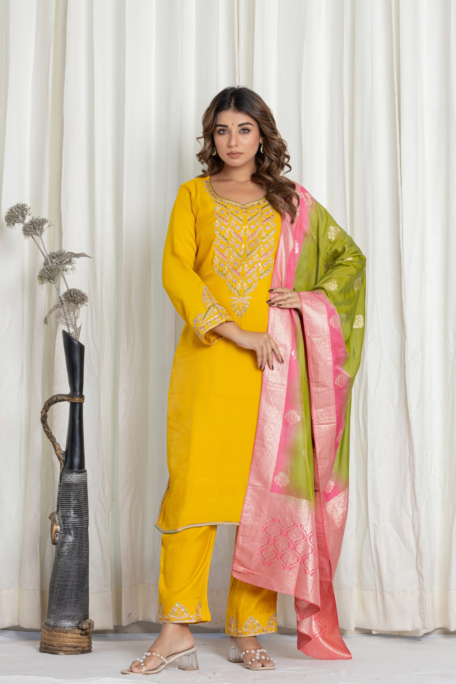 Add a vibrant splash of color to your ethnic wardrobe with this beautiful yellow silk kurta set. Featuring elegant thread embroidery and a premium Banarasi woven dupatta, this 3-piece suit set is perfect for festive functions, haldi ceremonies, and elegant daytime gatherings.